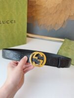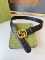 GUCCI gold double G buckle black textured belt, with black as the main color, showing low-key luxury. The exquisite G-shaped buckle design is made of high-quality metal and has a dazzling luster, highlighting the unique charm of the brand. The belt is made of high-quality leather, which is soft and delicate to the touch, wear-resistant and durable, giving you a long-term use experience.