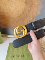This GUCCI gold double G black textured belt has become the darling of the fashion industry with its unique design and excellent quality. The belt is made of selected black leather, which is soft and delicate to the touch and has a natural luster, highlighting its unparalleled texture. The golden double G logo on the belt is the symbol of the GUCCI brand. With its unique shape and exquisite craftsmanship, it shows the brand’s unique charm and high-end temperament.