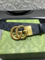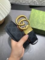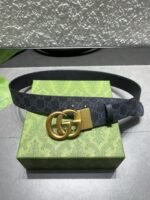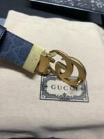 This Gucci gold double G logo luxury belt shows unparalleled nobility and taste with its unique gold double G logo and exquisite craftsmanship. The belt is made of top-quality leather, which is soft and elastic to the touch and durable. The golden double G logo is inlaid on the belt buckle, shining brightly, highlighting the nobility and uniqueness of the brand. The belt design is simple yet elegant, perfectly interpreting the perfect combination of fashion and classics.