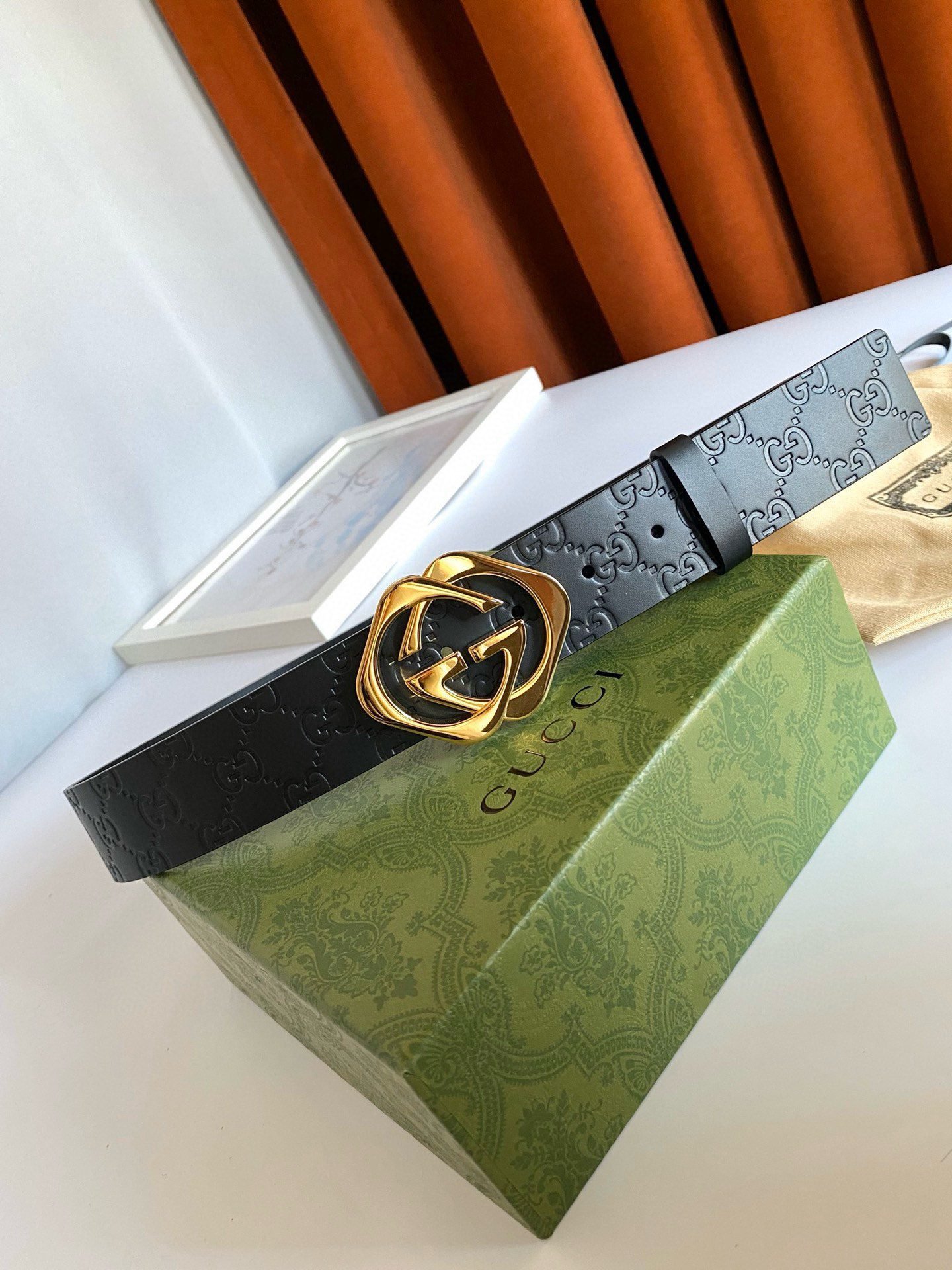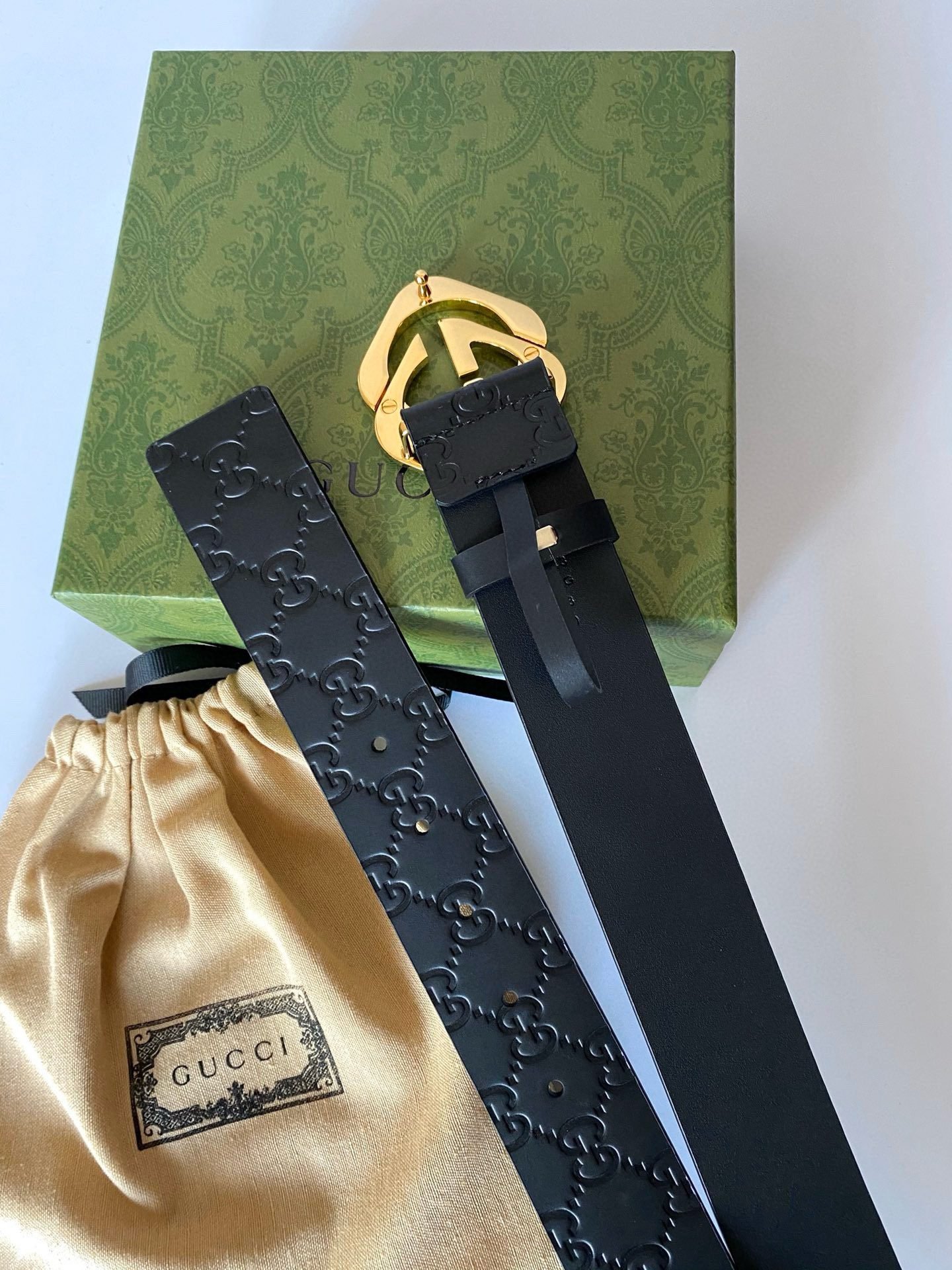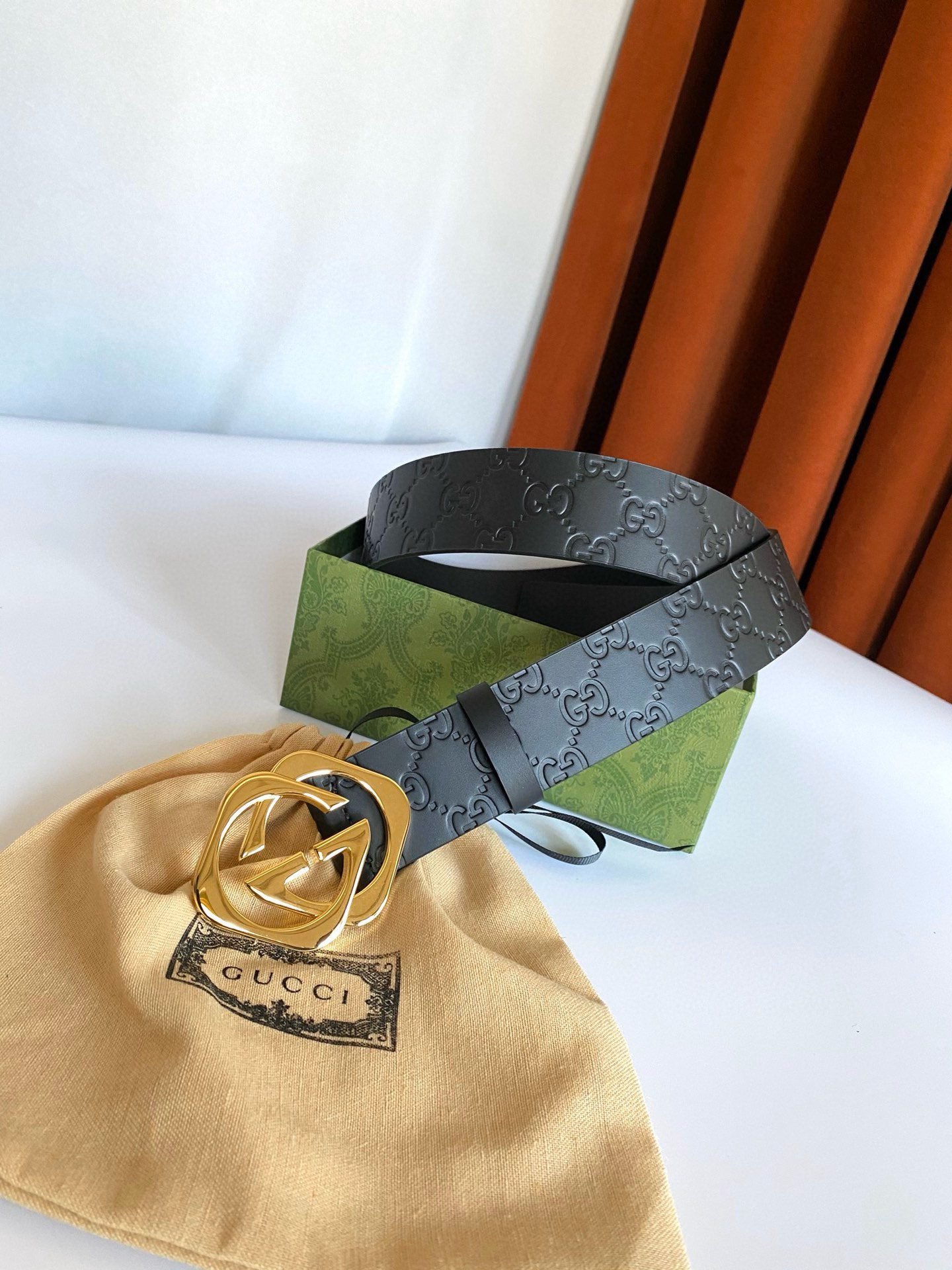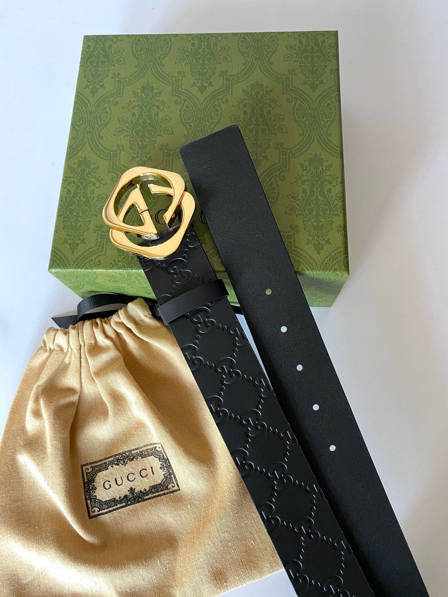 The Gucci gold logo black belt shows unparalleled charm with its elegant yet luxurious style. The black leather is made of high-quality materials, soft and delicate, comfortable to wear, and durable. The golden Gucci logo shines on the black belt, highlighting the brand’s nobility and uniqueness. The overall design is simple but not simple, showing the wearer’s taste and style.