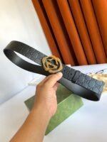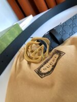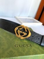 The Gucci gold logo black belt shows unparalleled charm with its elegant yet luxurious style. The black leather is made of high-quality materials, soft and delicate, comfortable to wear, and durable. The golden Gucci logo shines on the black belt, highlighting the brand’s nobility and uniqueness. The overall design is simple but not simple, showing the wearer’s taste and style.