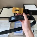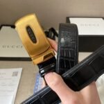 This Gucci gold square buckle black crocodile pattern belt shows unparalleled luxury and taste with its unique leather material and exquisite craftsmanship design. The black tone is classic and versatile, and the crocodile texture is even more unique, showing nobility and extraordinary. It is paired with a golden button with “GUCCI” printed on it and exquisite patterns, and the details highlight the brand’s charm.