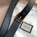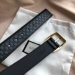 The Gucci gold square buckle black textured belt is made of high-quality leather materials and crafted with exquisite craftsmanship. Every inch reveals unparalleled texture and quality. The unique texture design not only adds to the fashion sense of the belt, but also makes it look high-end. Paired with a classic gold buckle, it is simple yet elegant, highlighting men’s nobility and taste.