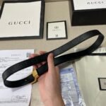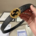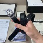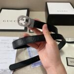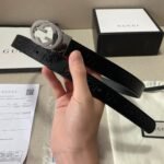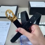 Gucci’s luxurious black double G buckle belt features a unique double G buckle design, showing unparalleled fashion taste and noble temperament. The belt is made of high-quality leather, which is soft and delicate to the touch, natural luster, wear-resistant and durable. The buckle part is made with exquisite craftsmanship, and the luster is dazzling, highlighting the brand’s nobility and luxury. The entire belt design is simple and elegant, reflecting the brand’s classic elements and incorporating modern fashion sense.