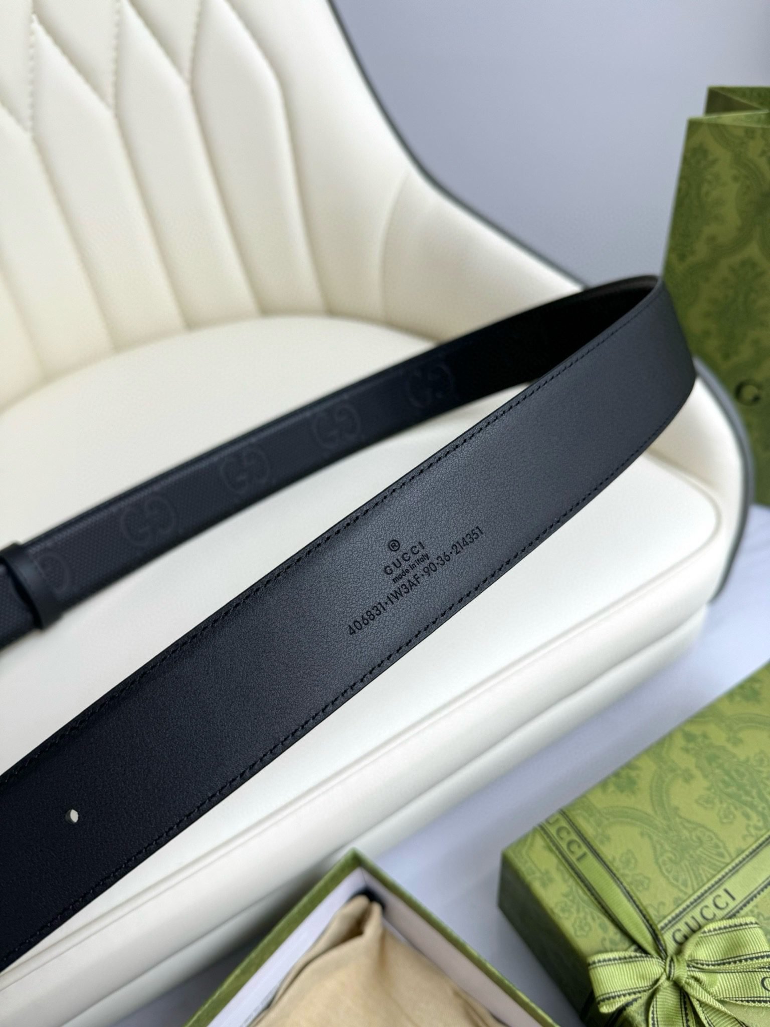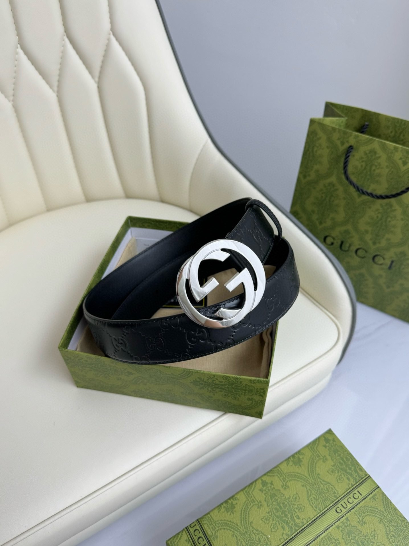 This Gucci luxury silver G buckle black belt perfectly combines classic and modern. The belt buckle head is centered on the silver G logo, showing the nobility and uniqueness of the Gucci brand. The black leather is carefully selected and processed, with excellent wear resistance and softness, allowing the wearer to experience the ultimate comfort. Every detail is processed with exquisite craftsmanship to ensure the perfect presentation of the product.