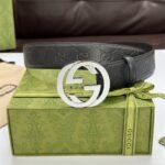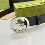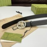 Gucci silver buckle black textured belt interprets the brand’s extraordinary charm with excellent quality and exquisite craftsmanship. Made of high-quality leather material, the surface is shiny and soft, and the touch is soft and comfortable, bringing the ultimate wearing experience to men. The silver double G logo buckle is the finishing touch of the belt, which is simple yet grand, highlighting the nobility and uniqueness of the brand.