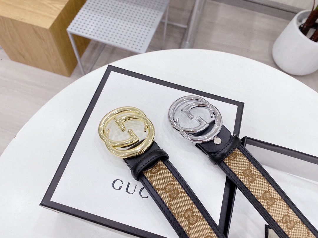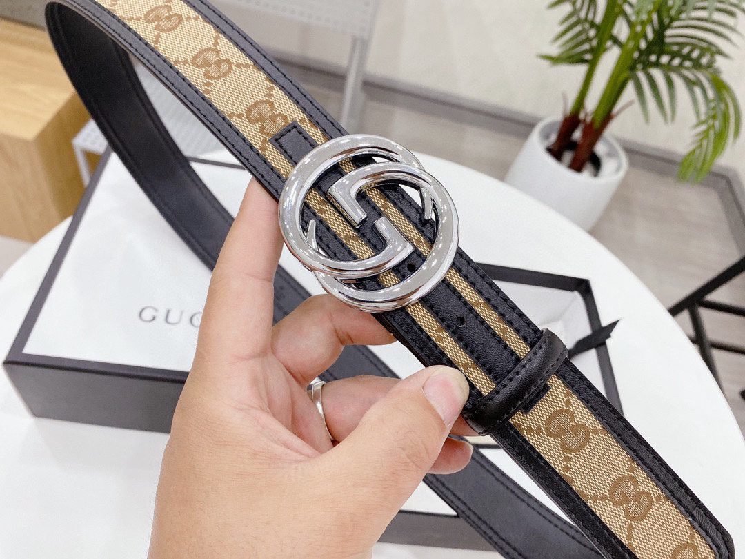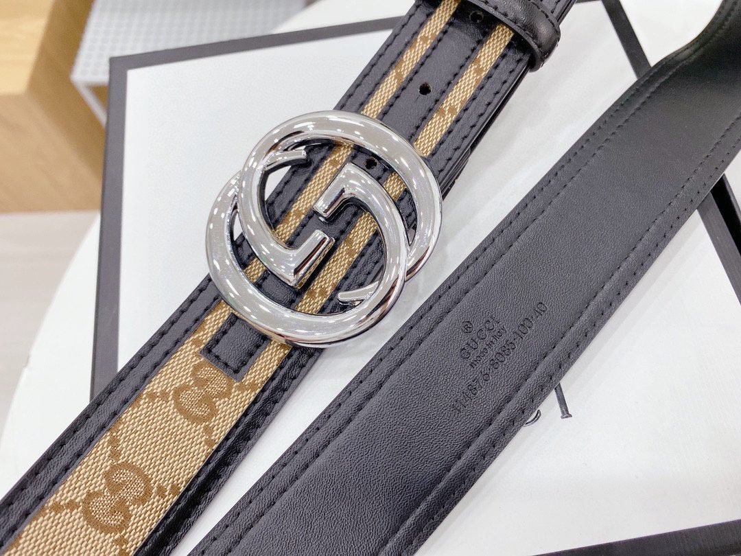 This Gucci silver buckle brown canvas belt shows the brand’s nobility and fashion with its unique design and high-quality materials. The belt is made of brown canvas, which is durable and lightweight, while also giving it a casual yet tasteful feel. The silver buckle design is simple and elegant, forming a sharp contrast with the brown canvas, adding a modern feel. The buckle is engraved with the classic “G” letter logo, highlighting the unique charm of the Gucci brand.