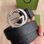 Gucci’s silver double G black textured belt is a combination of the brand’s exquisite craftsmanship and unique design. The belt is made of top-grade genuine leather, which has been finely polished and specially treated to present a smooth and delicate texture, soft and comfortable to the touch. The silver G buckle on the belt is made of high-quality alloy material, with a dazzling luster, forming a sharp contrast with the black leather, highlighting the brand’s nobility and luxury.