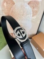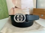 Gucci silver double G buckle black belt, with its unique double G logo buckle and pure black tone, highlights the elegance and nobility of the brand. The belt is made of top-quality leather, which is soft and delicate to the touch, wear-resistant and durable, and can maintain a new appearance for a long time. The double G buckle is made of high-quality metal, with bright luster, exquisiteness and elegance, highlighting the wearer’s unique taste.