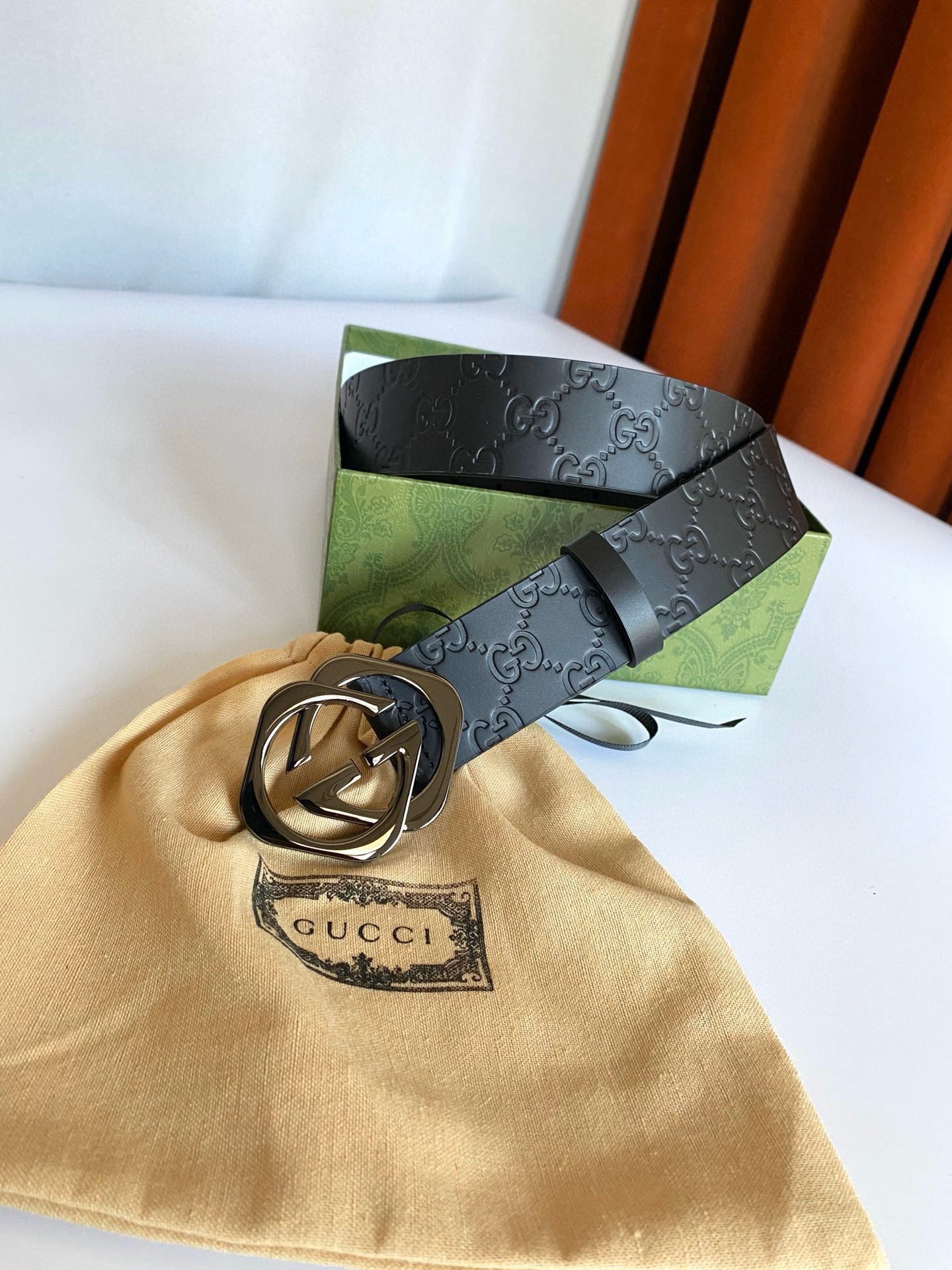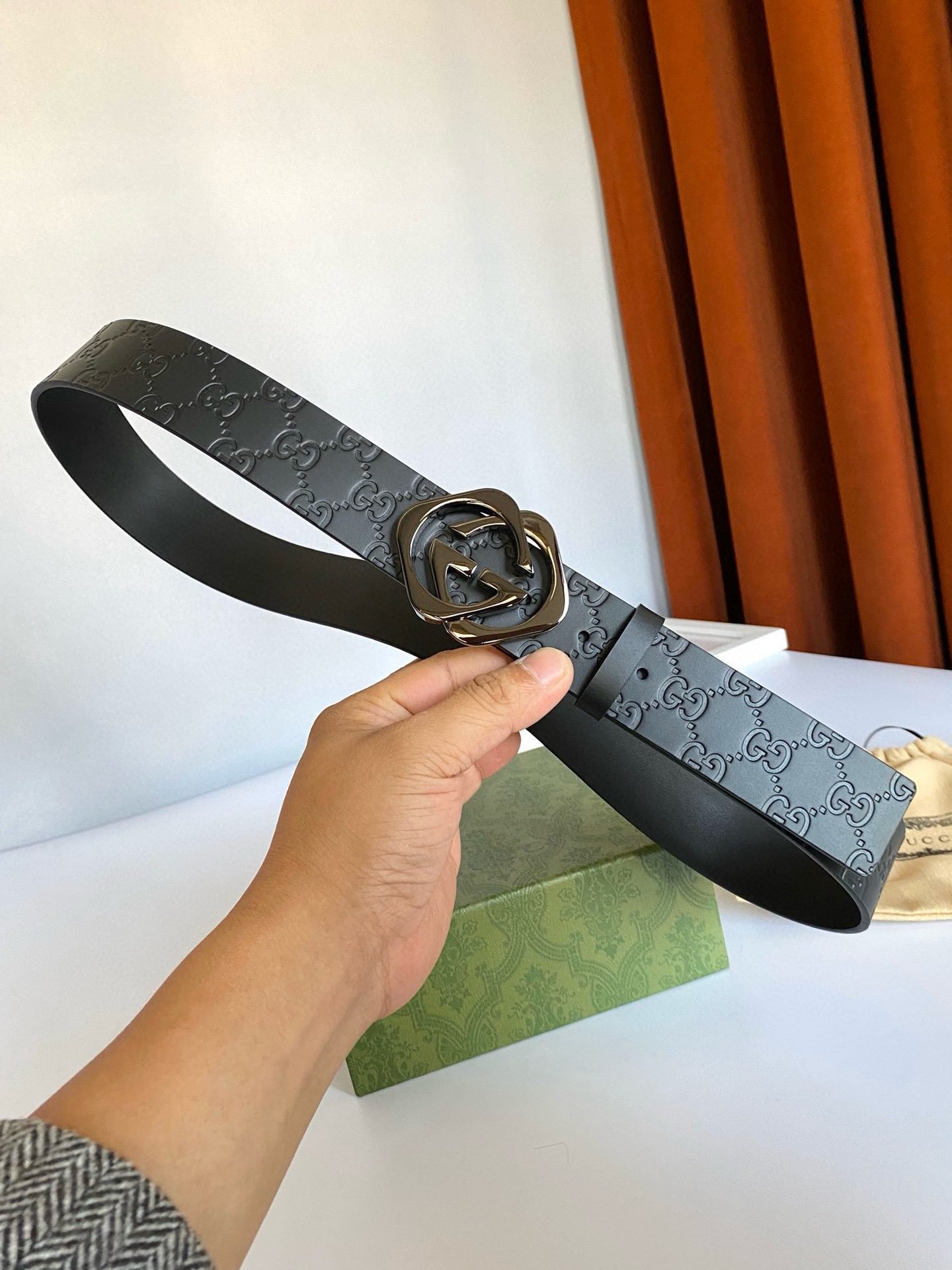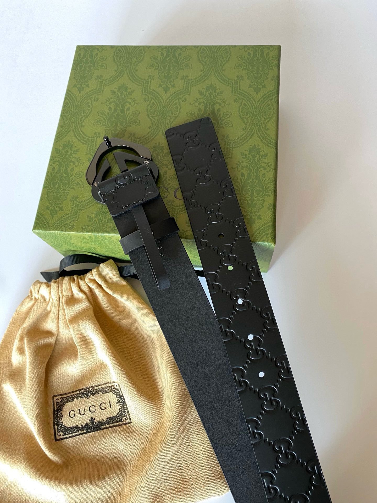 Gucci black double G buckle black textured belt, with its unique G-shaped buckle design, highlights the brand’s nobility and elegance. The belt is made of high-quality black leather, which is soft and delicate to the touch while being wear-resistant and durable. The G-shaped buckle is made of fine steel, and its surface has been polished to give it a bright luster, showing its luxurious quality. In addition, the length of the belt can be flexibly adjusted according to personal waist circumference to ensure wearing comfort.
