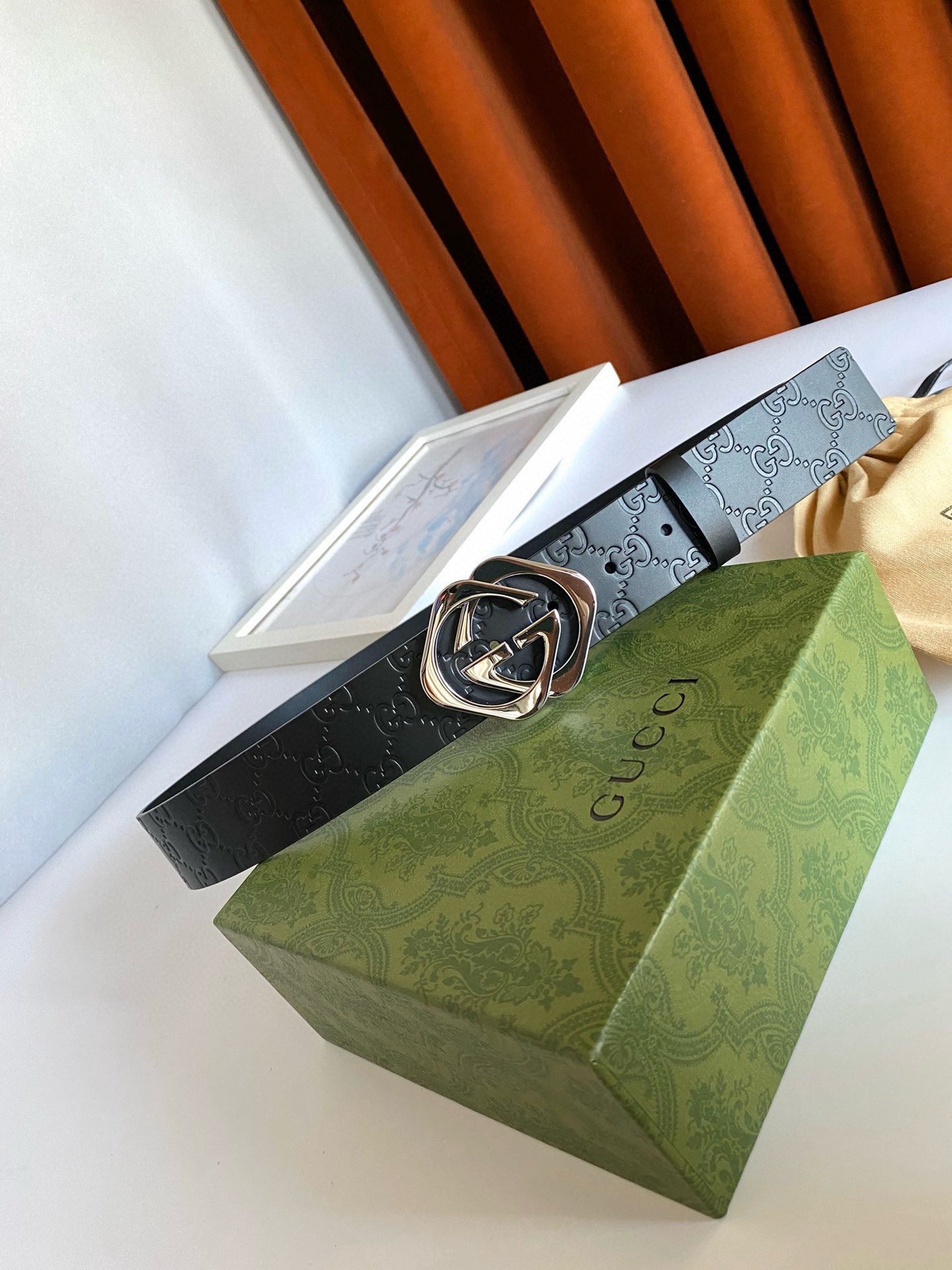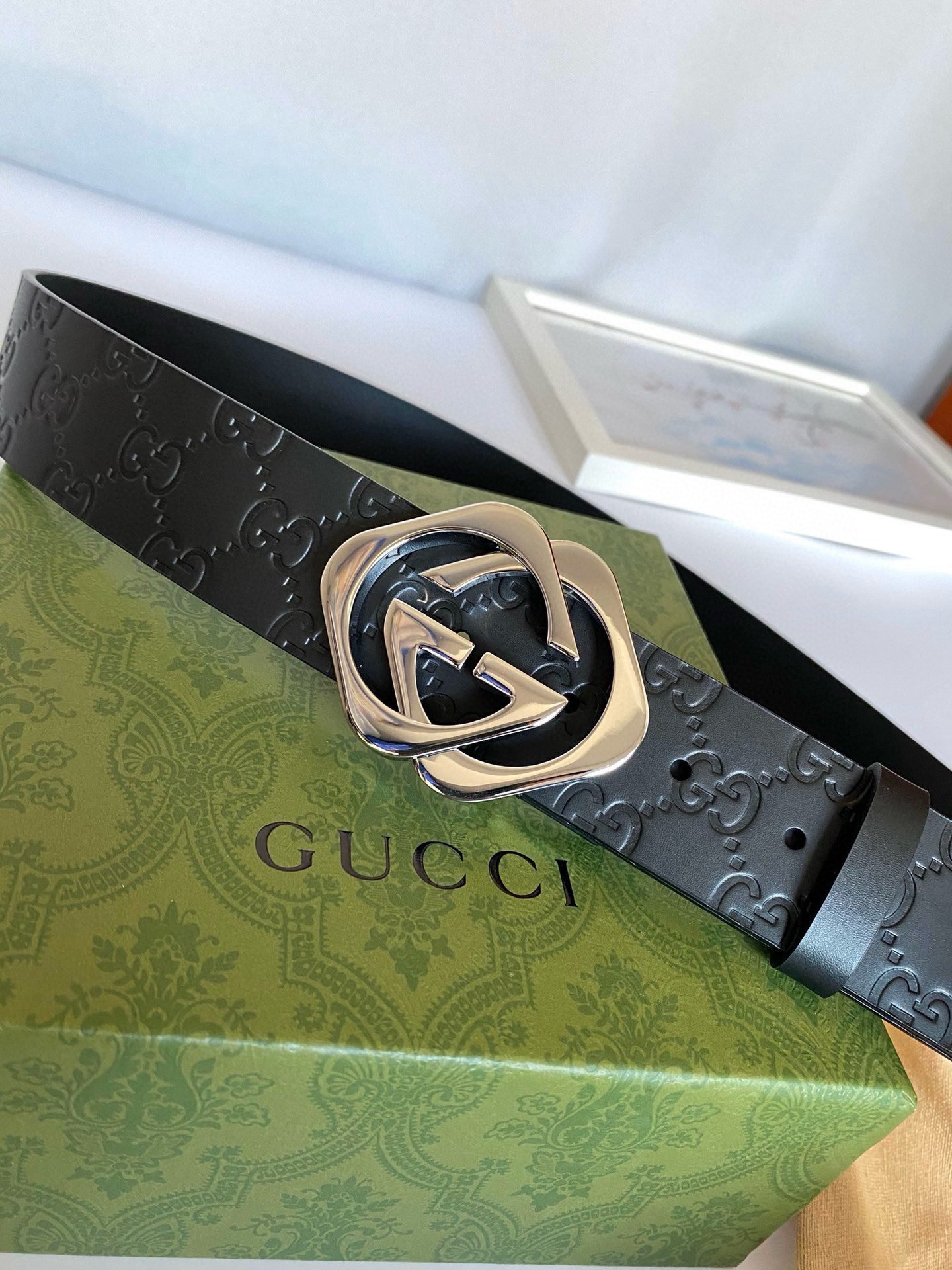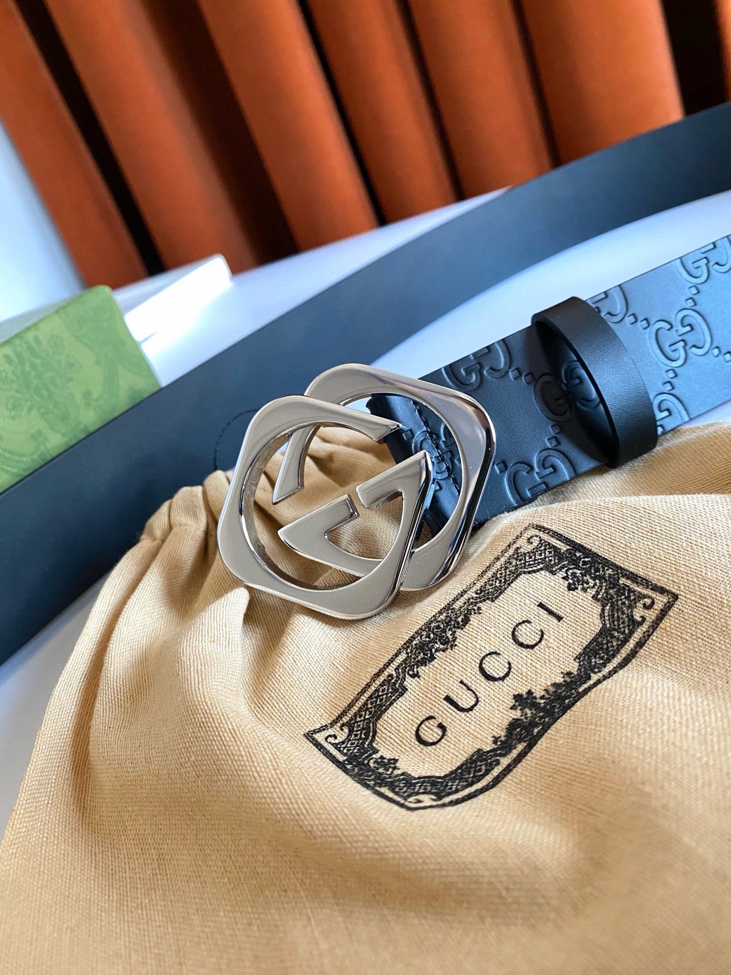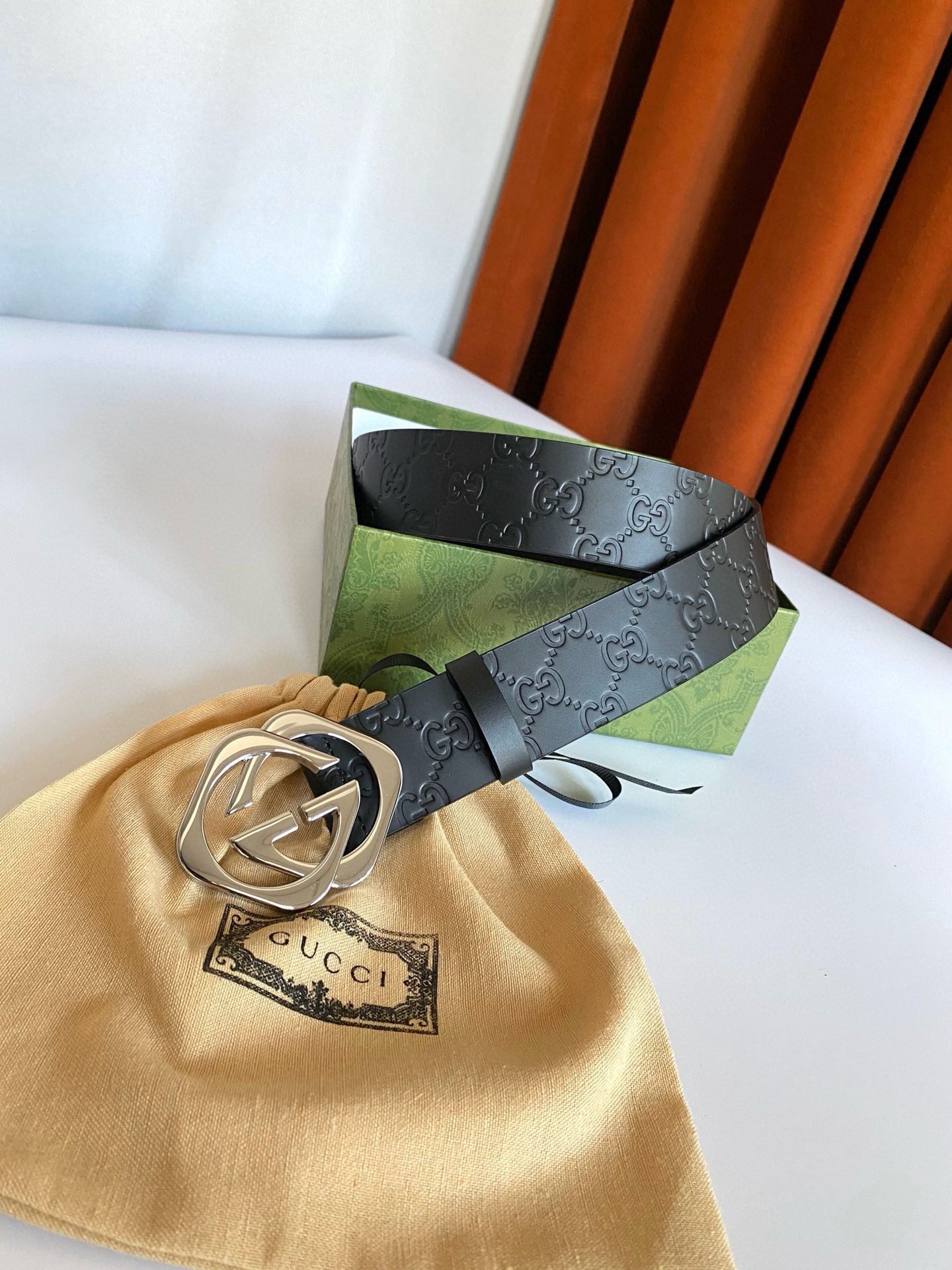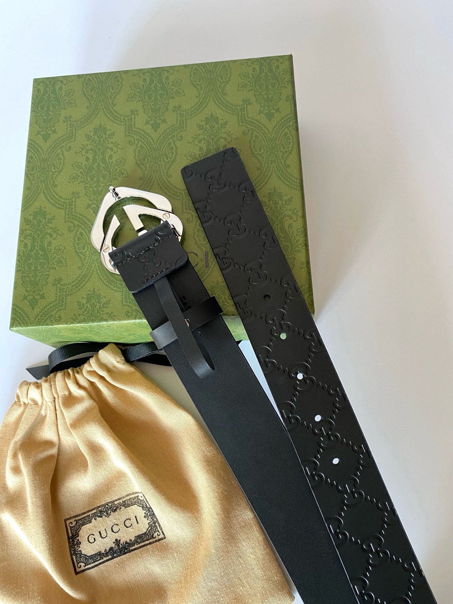 This Gucci silver double G buckle black textured belt highlights the brand’s unique charm with its simple and elegant design. Made of top-grade leather material, the surface is smooth and delicate, soft and comfortable to the touch, and has excellent durability. The silver buckle is made with exquisite craftsmanship and has a bright luster. It contrasts sharply with the black belt and highlights the wearer’s extraordinary taste.