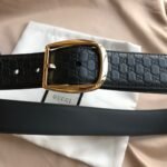 The Gucci square buckle black textured belt combines the brand’s classic square logo design, showing the unique brand charm of Gucci. The belt is made of high-quality leather, with soft and delicate texture and excellent hand feel. It is both durable and fashionable. The golden buckle is made of high-quality alloy material, which is strong and wear-resistant and has extremely high gloss, highlighting the wearer’s taste and dignity.
