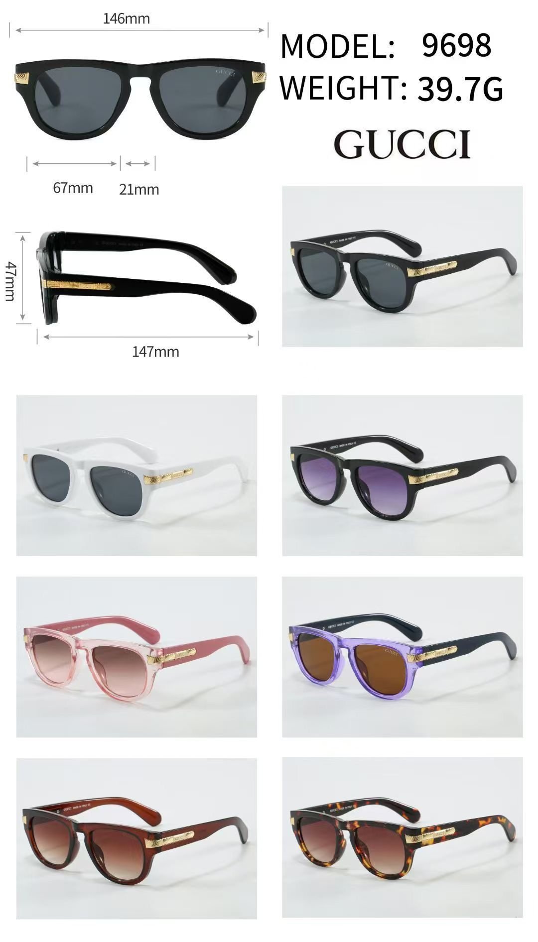Elevate your accessory collection with Gucci’s sunglasses (Model 9698). Featuring a range of stylish options—from classic black and gradient purple lenses to designs in white, pink, purple, brown, and tortoiseshell frames, all adorned with the brand’s signature gold – toned detailing on the temples—these sunglasses blend a chic silhouette with Gucci’s iconic luxury.