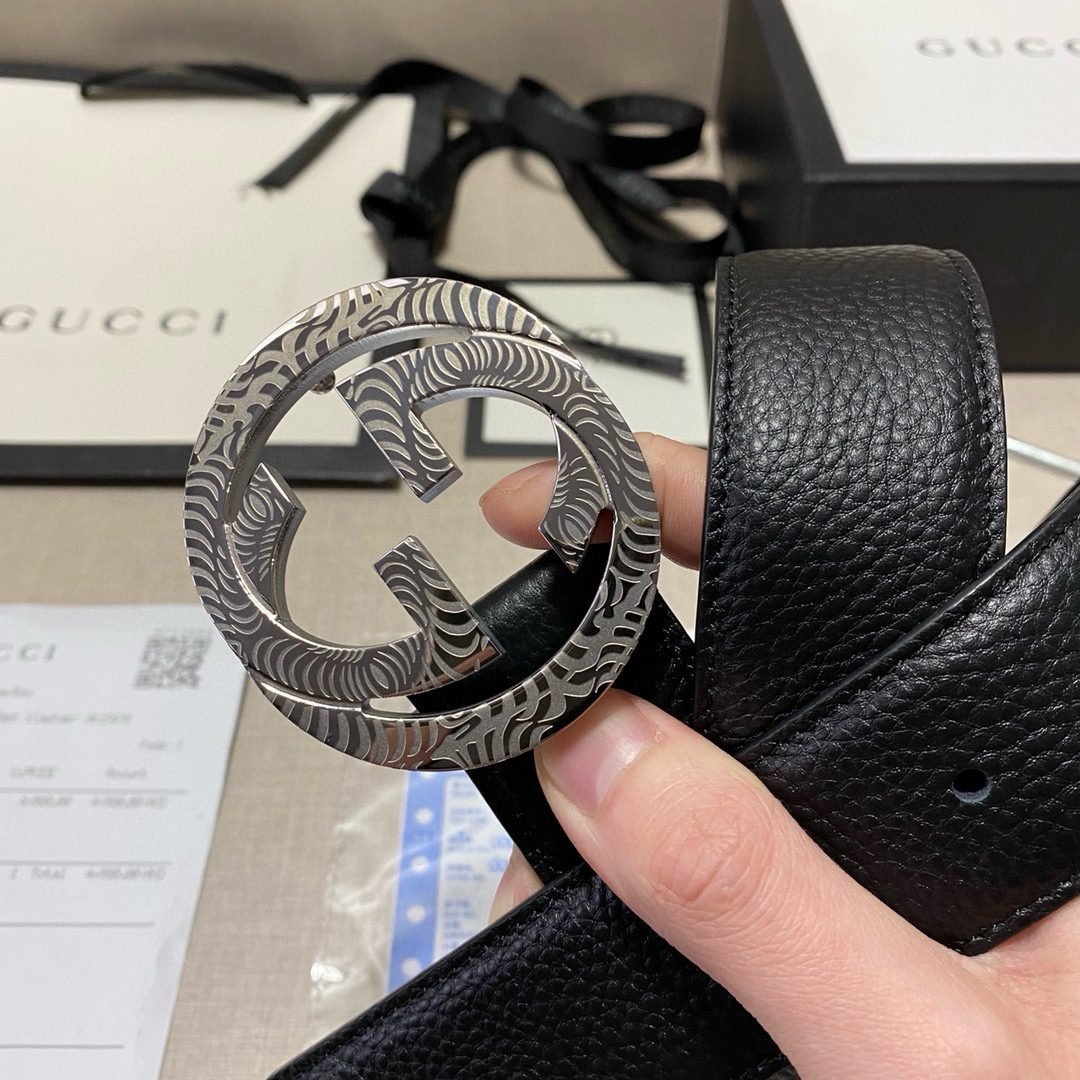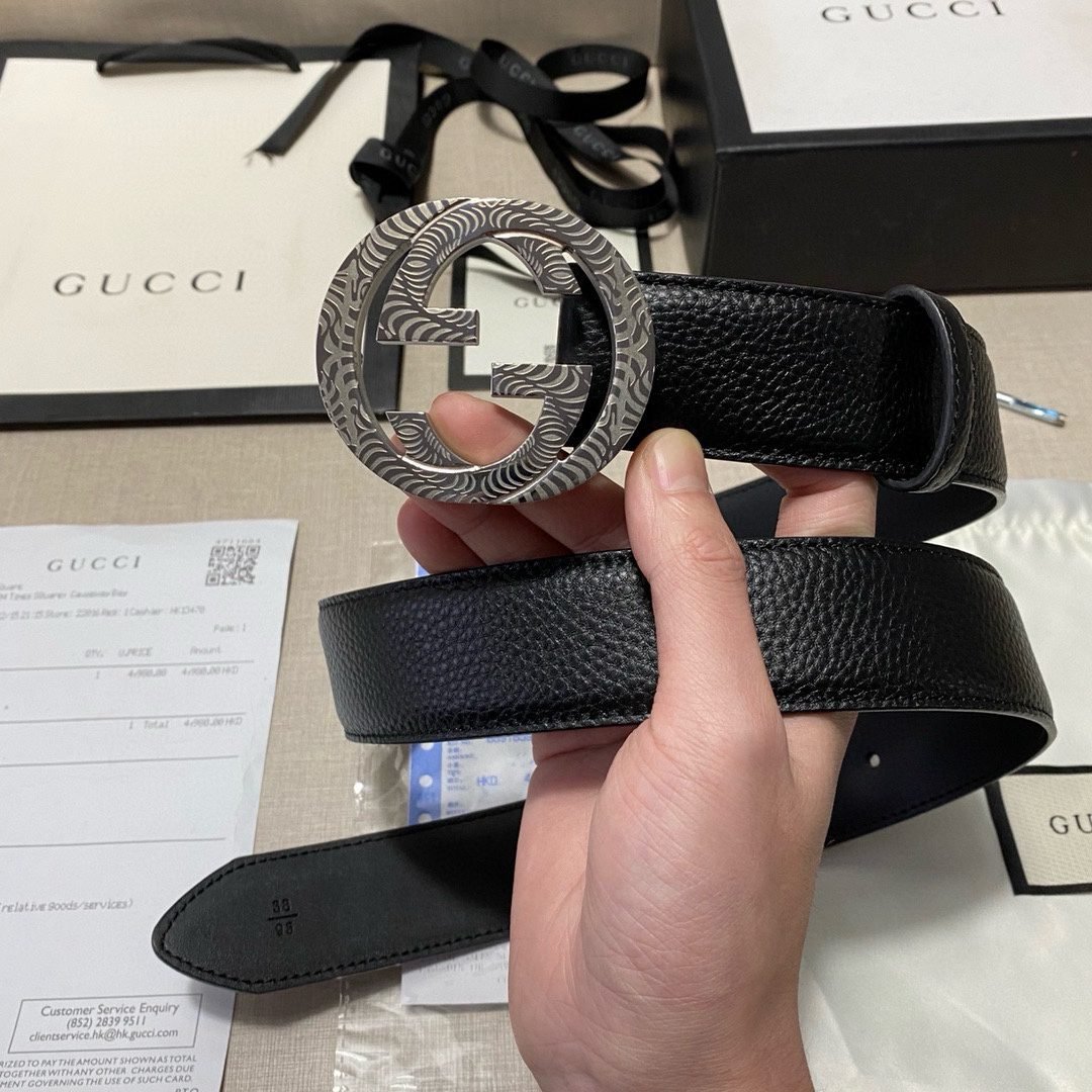 This Gucci textured double-G buckle black belt combines the brand’s consistent elegance and luxury. The belt is made of top-grade leather material, with a natural and delicate texture, soft and elastic feel. The surface of the belt has been specially treated to give it a unique black luster. Showing nobility and elegance, the belt buckle is made of high-quality metal, and the gold and black are perfectly matched, showing the brand’s charm.