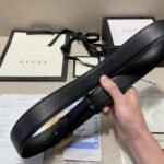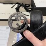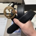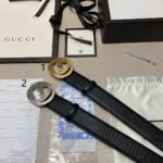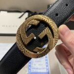 This Gucci textured double-G buckle black belt combines the brand’s consistent elegance and luxury. The belt is made of top-grade leather material, with a natural and delicate texture, soft and elastic feel. The surface of the belt has been specially treated to give it a unique black luster. Showing nobility and elegance, the belt buckle is made of high-quality metal, and the gold and black are perfectly matched, showing the brand’s charm.