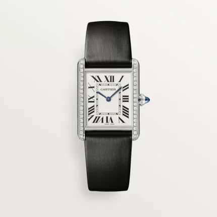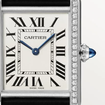Tank Must watch, large model, high autonomy quartz movement. Steel case, bezel set with 42 brilliant-cut diamonds totaling 0.48 carats,