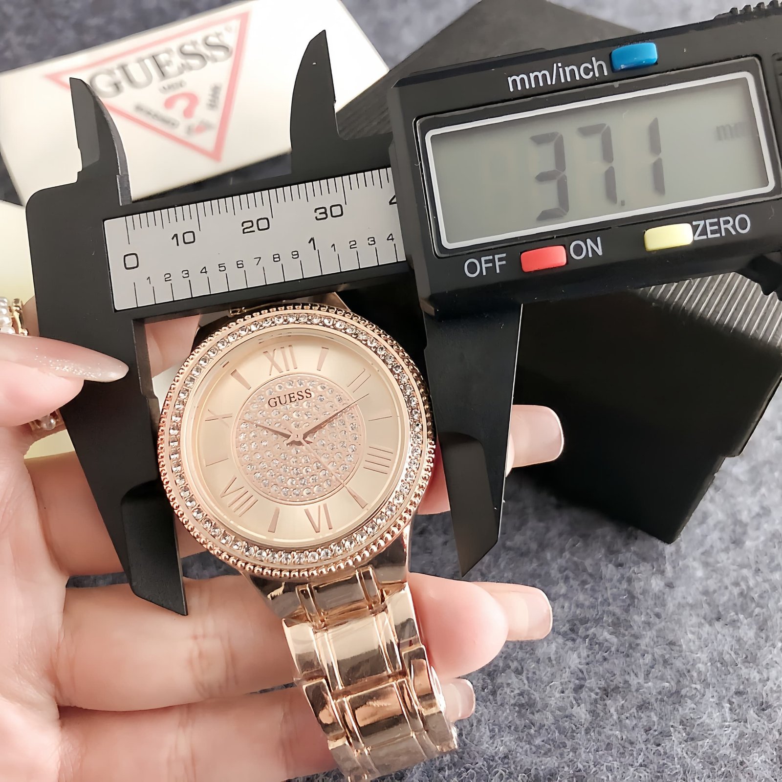 Guess GS 2807 series watches blend trendy style with luxurious details. Featuring elegant round dials with Roman numerals and shimmering crystal accents, these timepieces come in chic metal tones like silver, two – tone gold, gold, and rose gold. Paired with sleek metal bracelets, they are perfect for adding a touch of glamour to any outfit, whether for daily wear or special occasions.