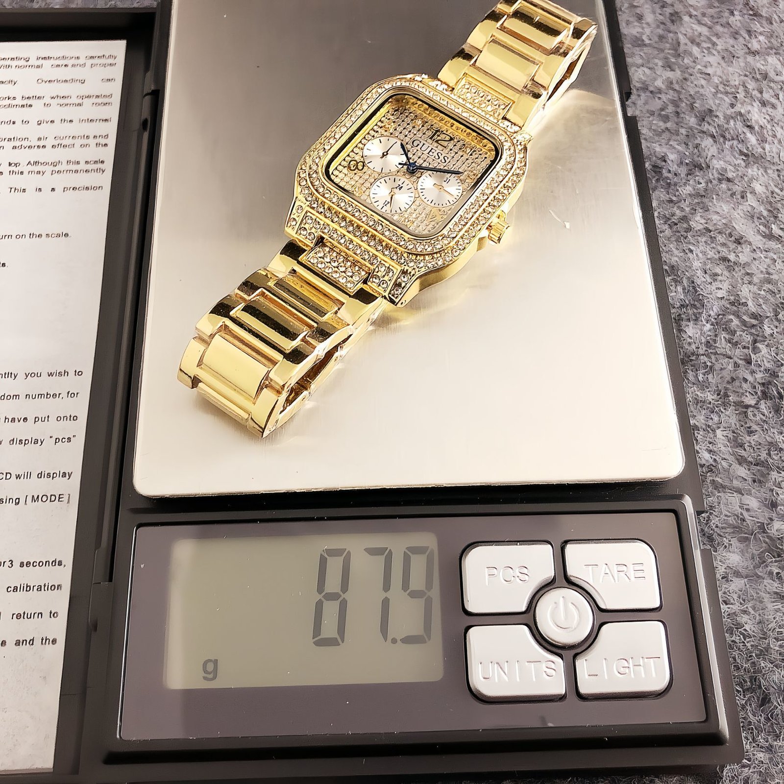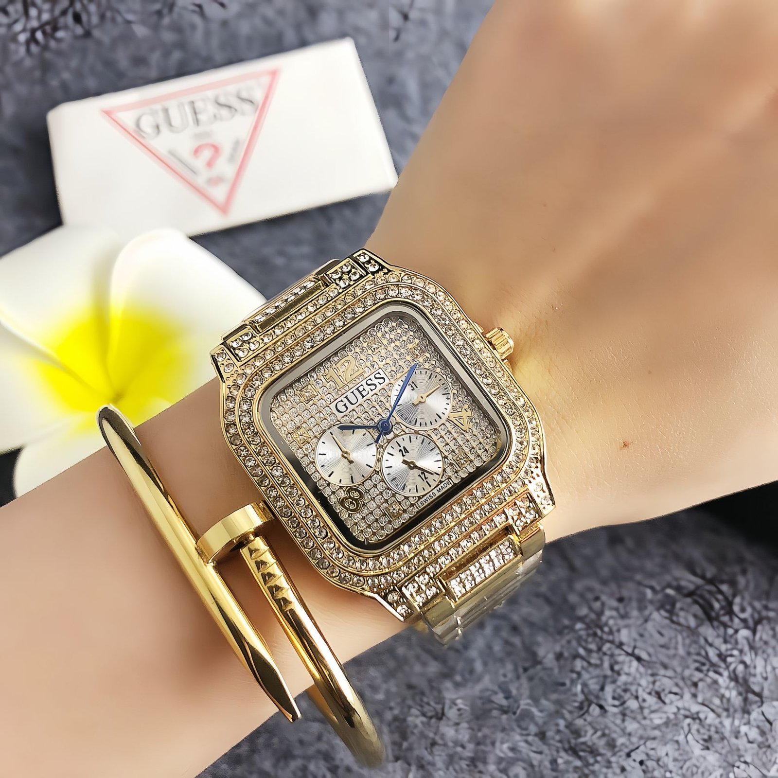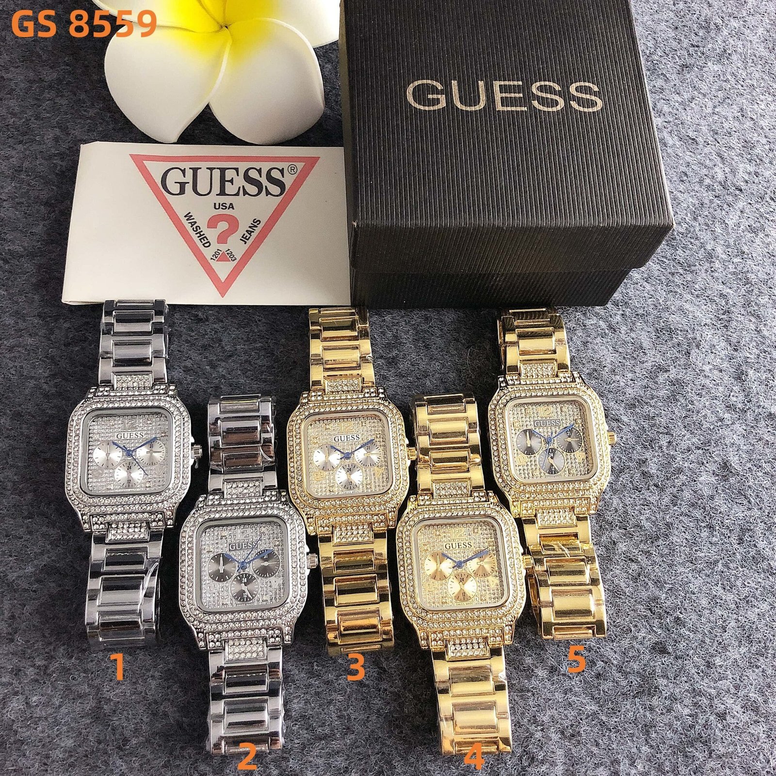 Guess GS 8559 series watches blend vintage flair with glamorous detailing. Featuring square dials, chronograph functions, and sparkling crystal embellishments, they come in chic tones like silver and gold. Embodying Guess’ signature fusion of bold style and contemporary trends, these timepieces add a touch of opulent charm to any look, perfect for those who love eye-catching, fashion-forward accessories that make a statement in both daily wear and special occasions.