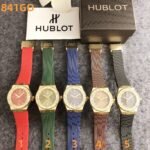 Hublot 841GO series watches embody avant-garde luxury, featuring bold cases with crystal-encrusted bezels, vibrant rubber straps in shades like red, green, blue, brown, and black, and the brand’s signature technical detailing. With Hublot’s legacy of innovative design and opulent craftsmanship, these timepieces exude dynamic sophistication. Perfect for those who appreciate a blend of high-octane style and colorful versatility, they make a striking statement suitable for both special occasions and bold daily ensembles.