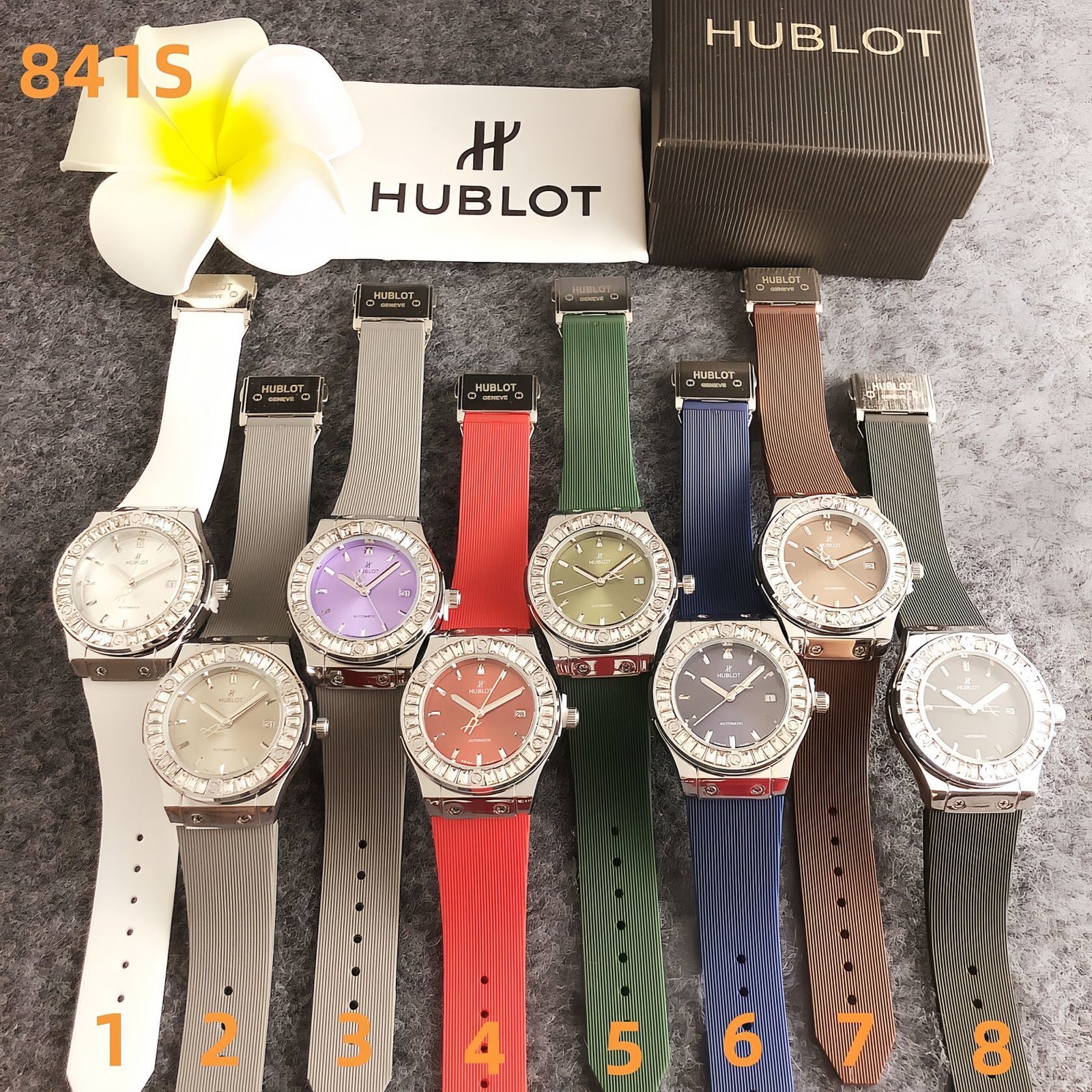 Hublot 841S series watches embody avant-garde luxury, featuring bold cases with crystal-encrusted bezels, vibrant rubber straps in shades like white, gray, red, green, blue, brown, and charcoal, and the brand’s signature technical detailing. With Hublot’s legacy of innovative design and opulent craftsmanship, these timepieces exude dynamic sophistication. Perfect for those who appreciate a blend of high-octane style and colorful versatility, they make a striking statement suitable for both special occasions and bold daily ensembles.