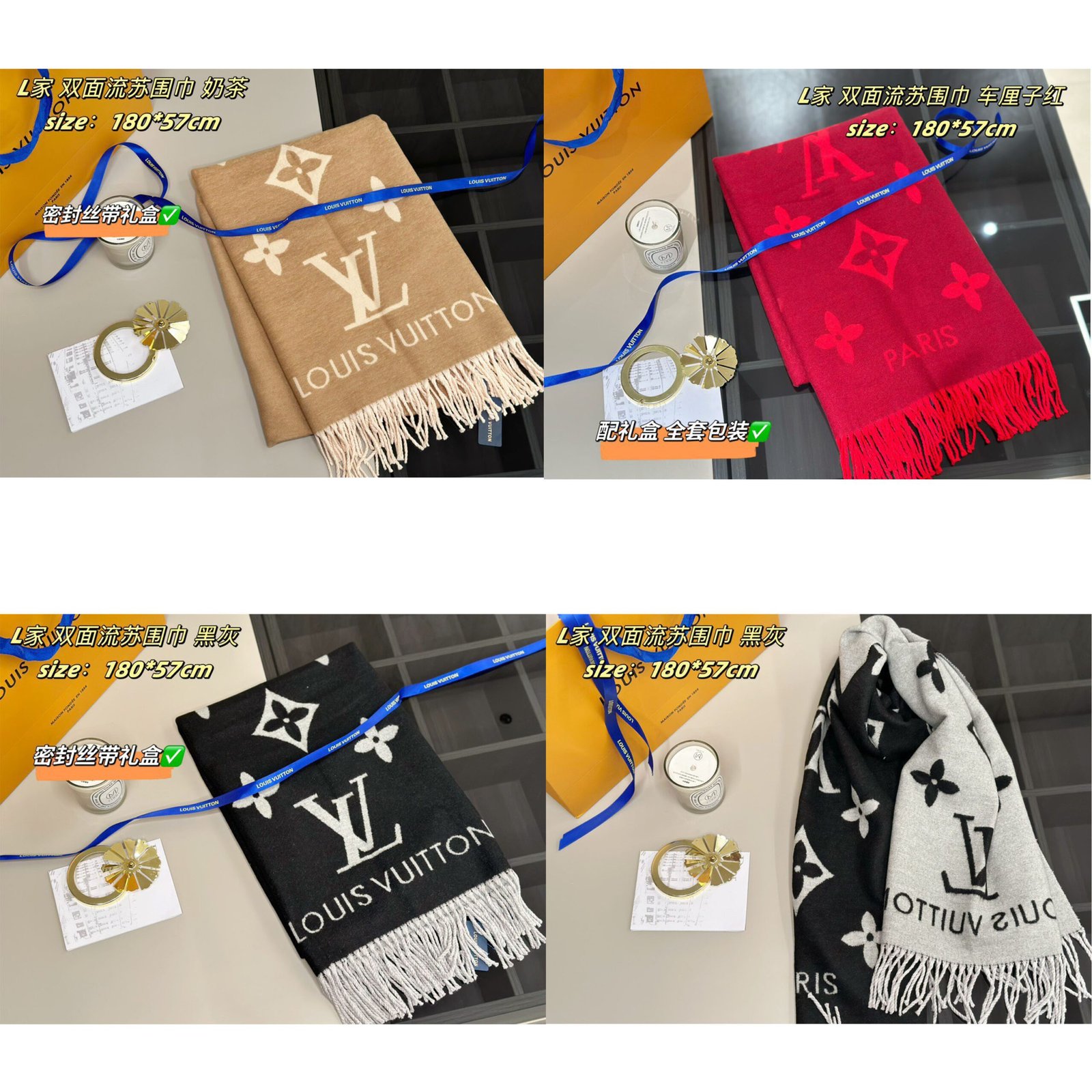 Gift box packaging size:170*35cm ,Lv Home has added double-sided scarves that are so beautiful! Milk tea color available on both sides