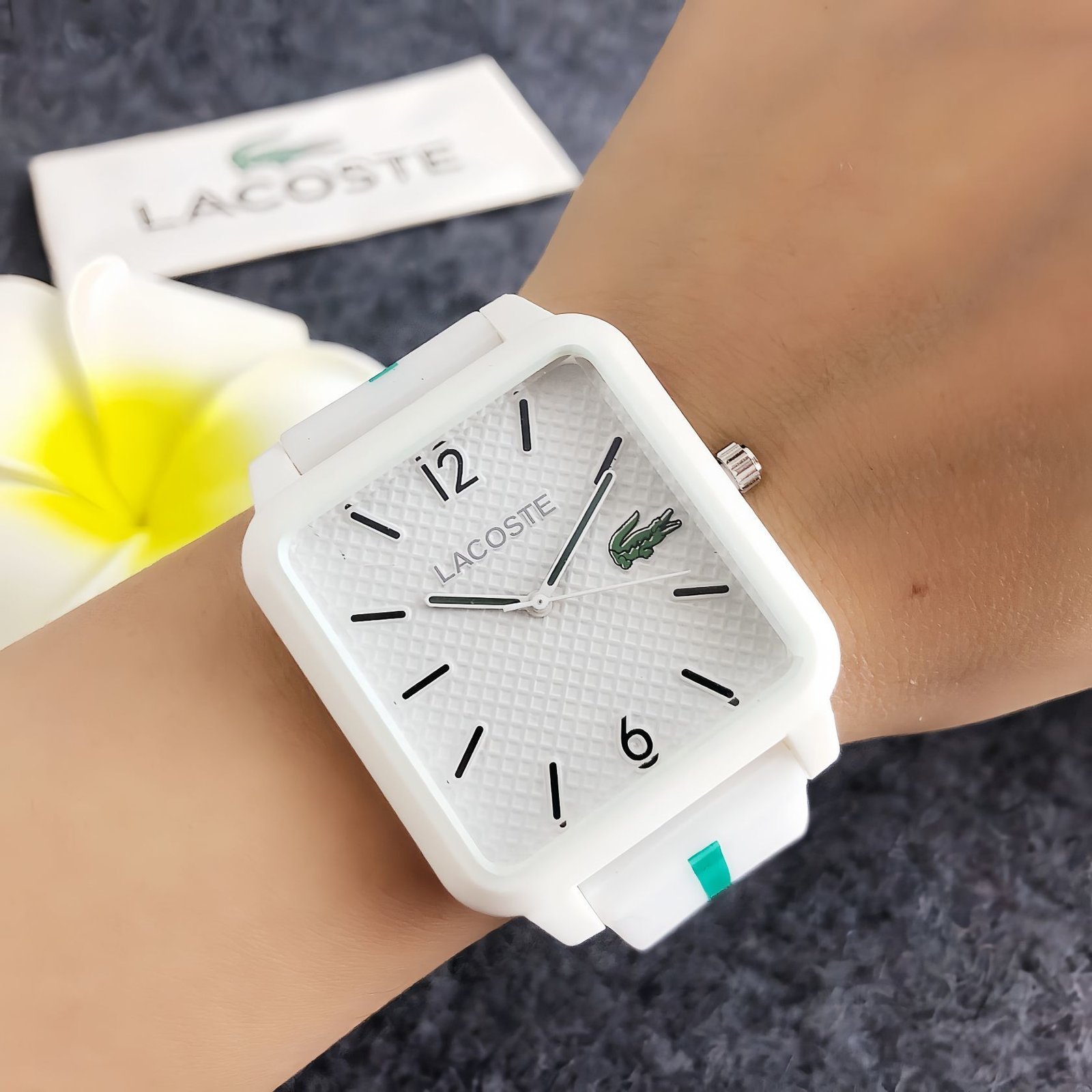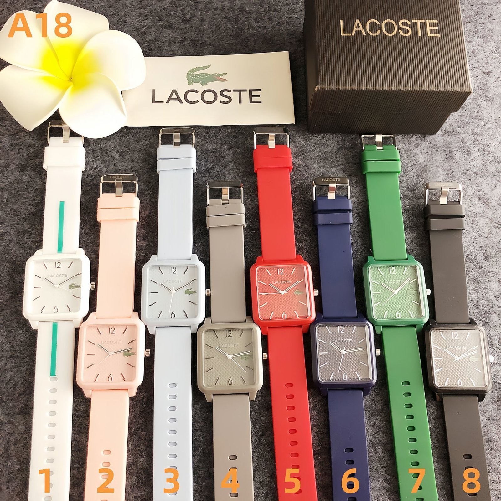 Lacoste A18 series watches embody playful casual sophistication, featuring square dials with the brand’s iconic crocodile motif, colorful silicone straps in shades like white, pink, light blue, gray, red, navy, green, and charcoal, and clean, readable detailing. With Lacoste’s legacy of sporty-chic design and versatility, these timepieces exude laid-back style. Perfect for those who appreciate a blend of geometric design and vibrant color options, they make a stylish statement suitable for everyday wear and casual adventures.