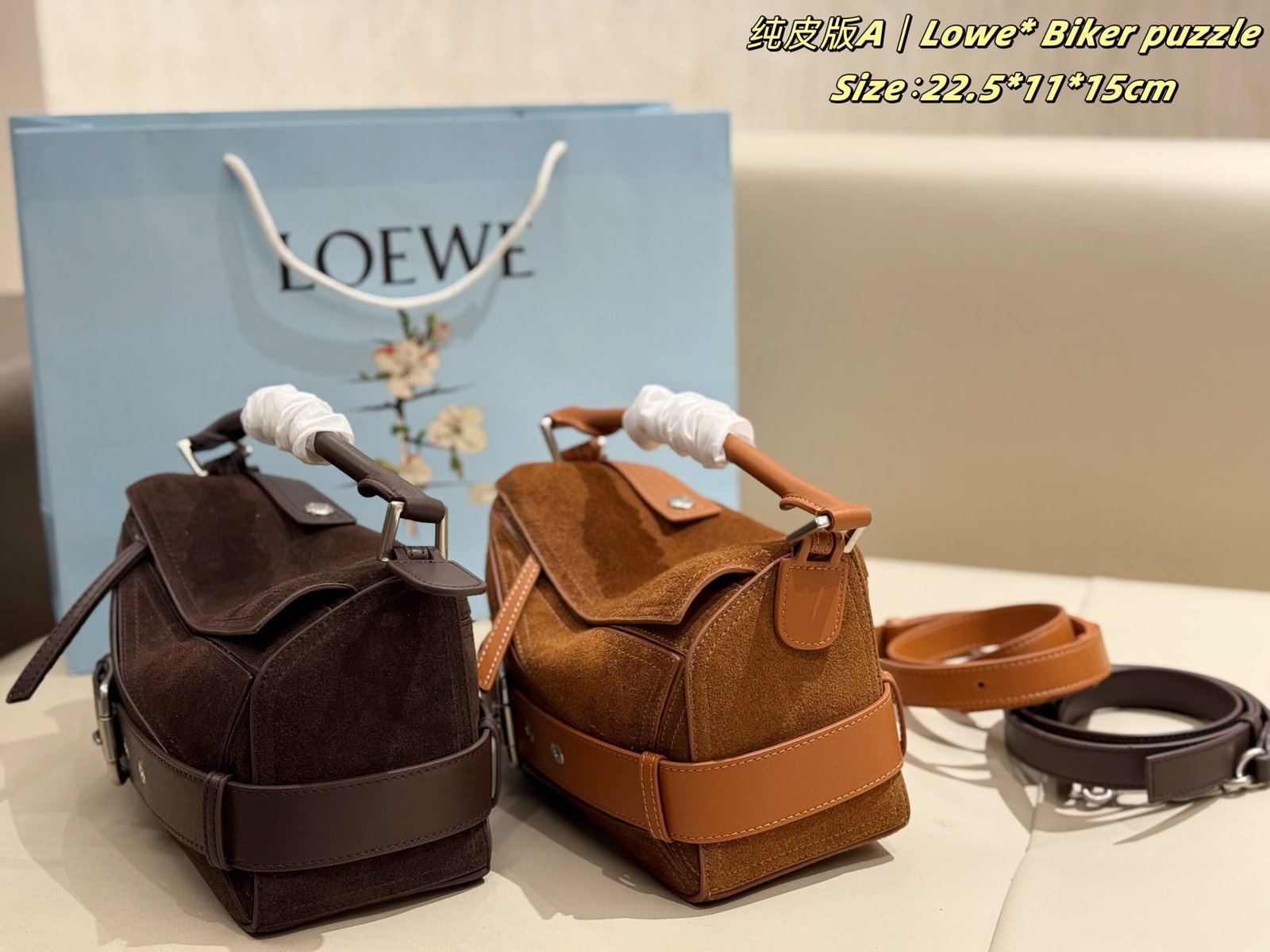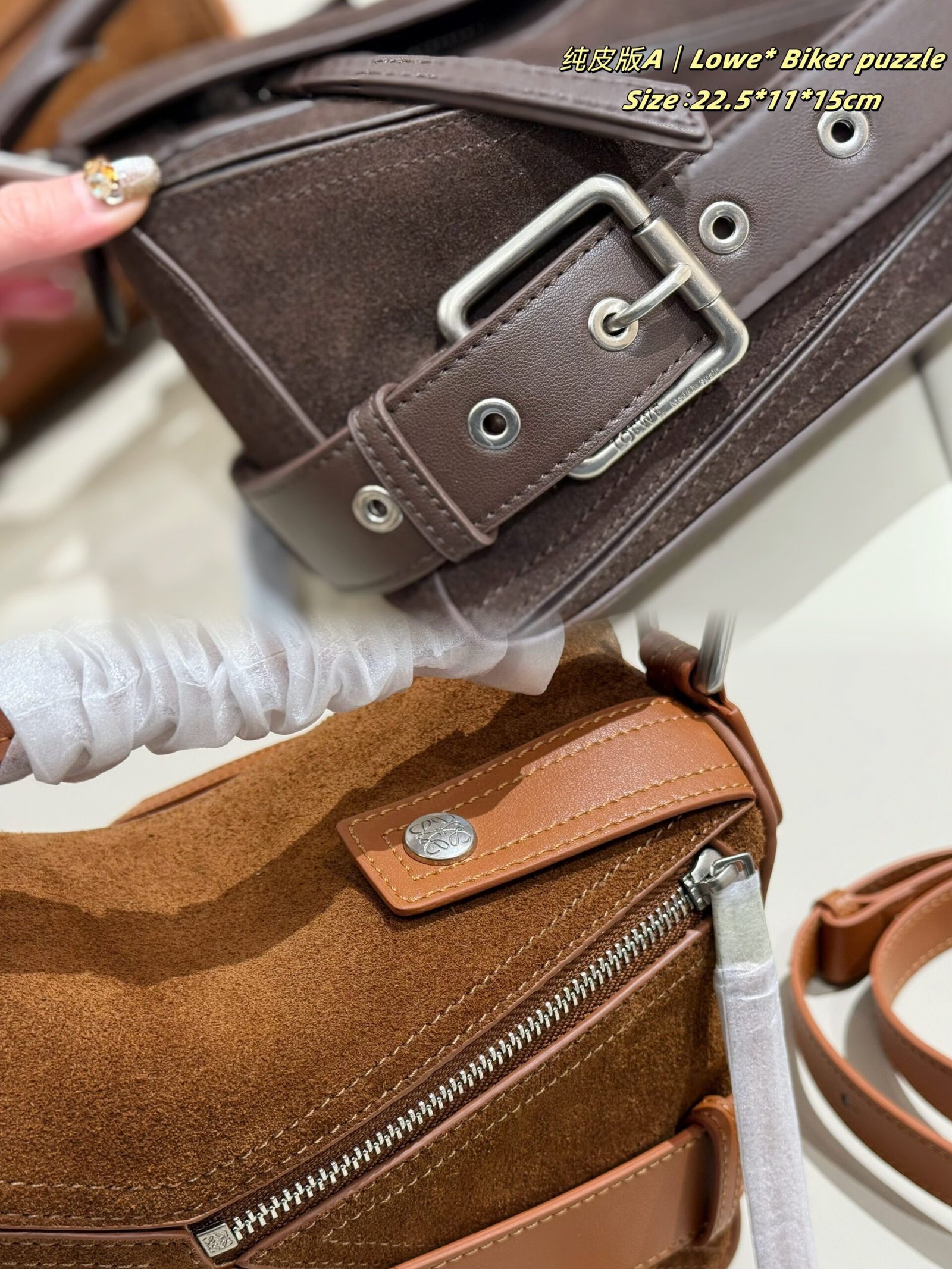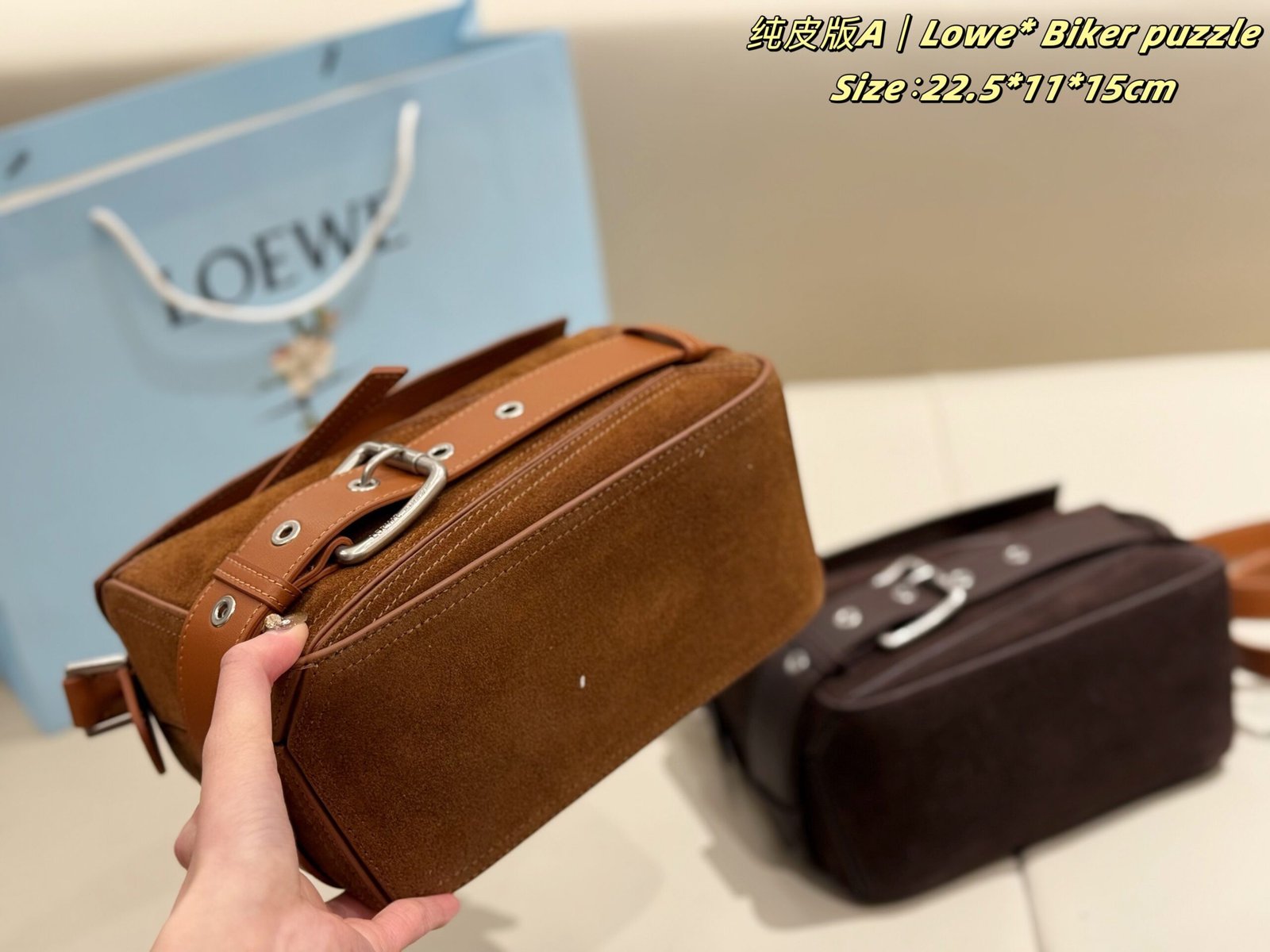 ✨ The new suede version of LOEWE’s Biker Puzzle series blends the iconic geometric silhouette with retro biker elements, crafted from soft suede paired with durable leather for a rugged texture. Accented with signature metal buckle straps and vintage details, it combines retro edge with luxury sophistication.