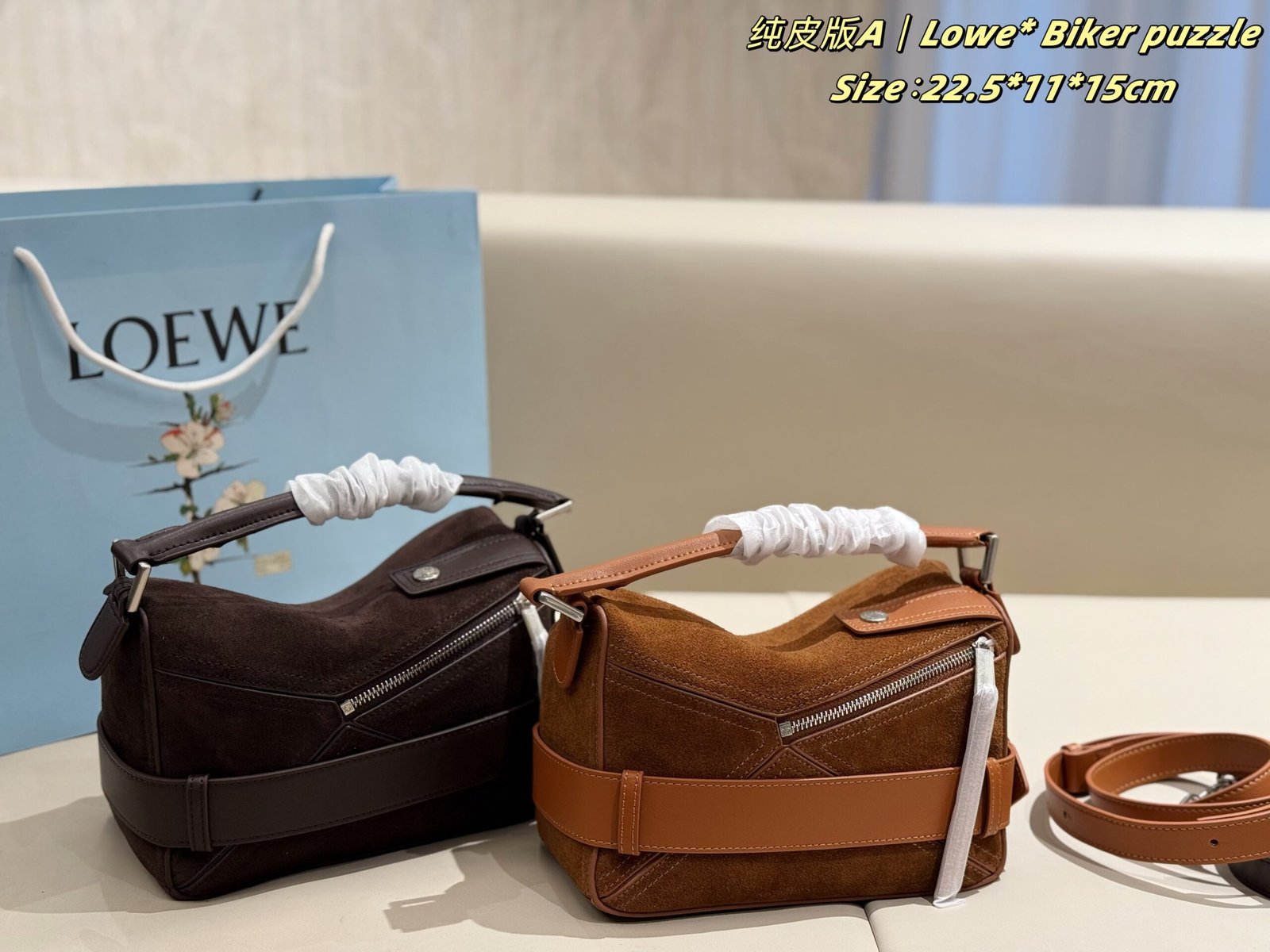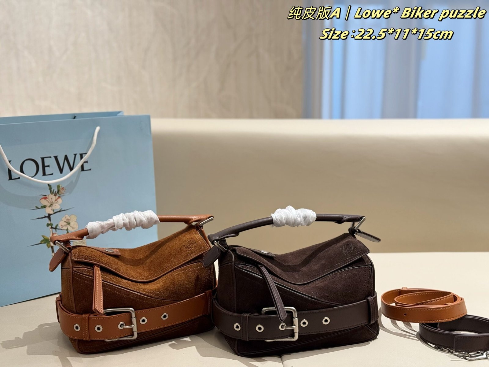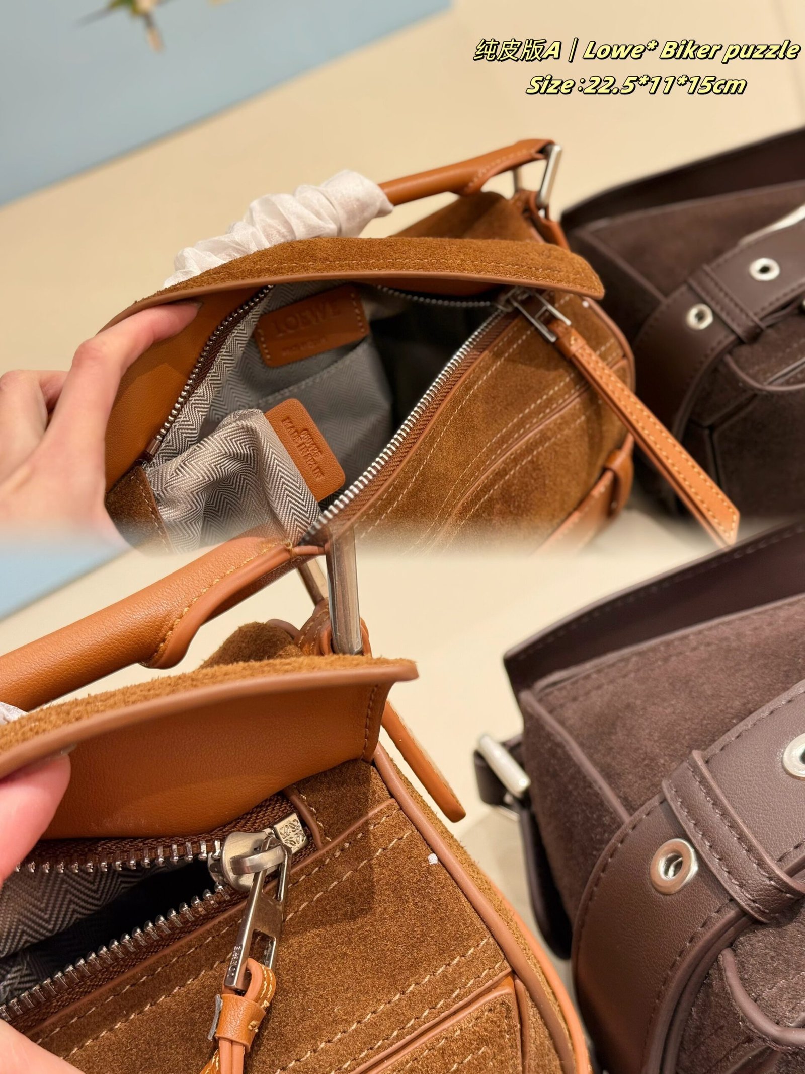 ✨ The new suede version of LOEWE’s Biker Puzzle series blends the iconic geometric silhouette with retro biker elements, crafted from soft suede paired with durable leather for a rugged texture. Accented with signature metal buckle straps and vintage details, it combines retro edge with luxury sophistication.