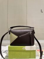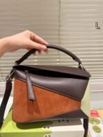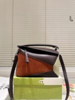 Loewe Puzzle Large bag redefines architectural luxury, featuring the brand’s iconic geometric silhouette, a refined mix of suede and leather, and an elegant color-blocking palette of brown, taupe, and cream. Embodying Loewe’s legacy of exceptional craftsmanship and avant-garde design, this bag seamlessly merges artistic structure with everyday functionality. Perfect for those who crave a blend of timeless elegance and versatile wear, it makes a distinctive statement suitable for any occasion, from daily commutes to elevated social events.