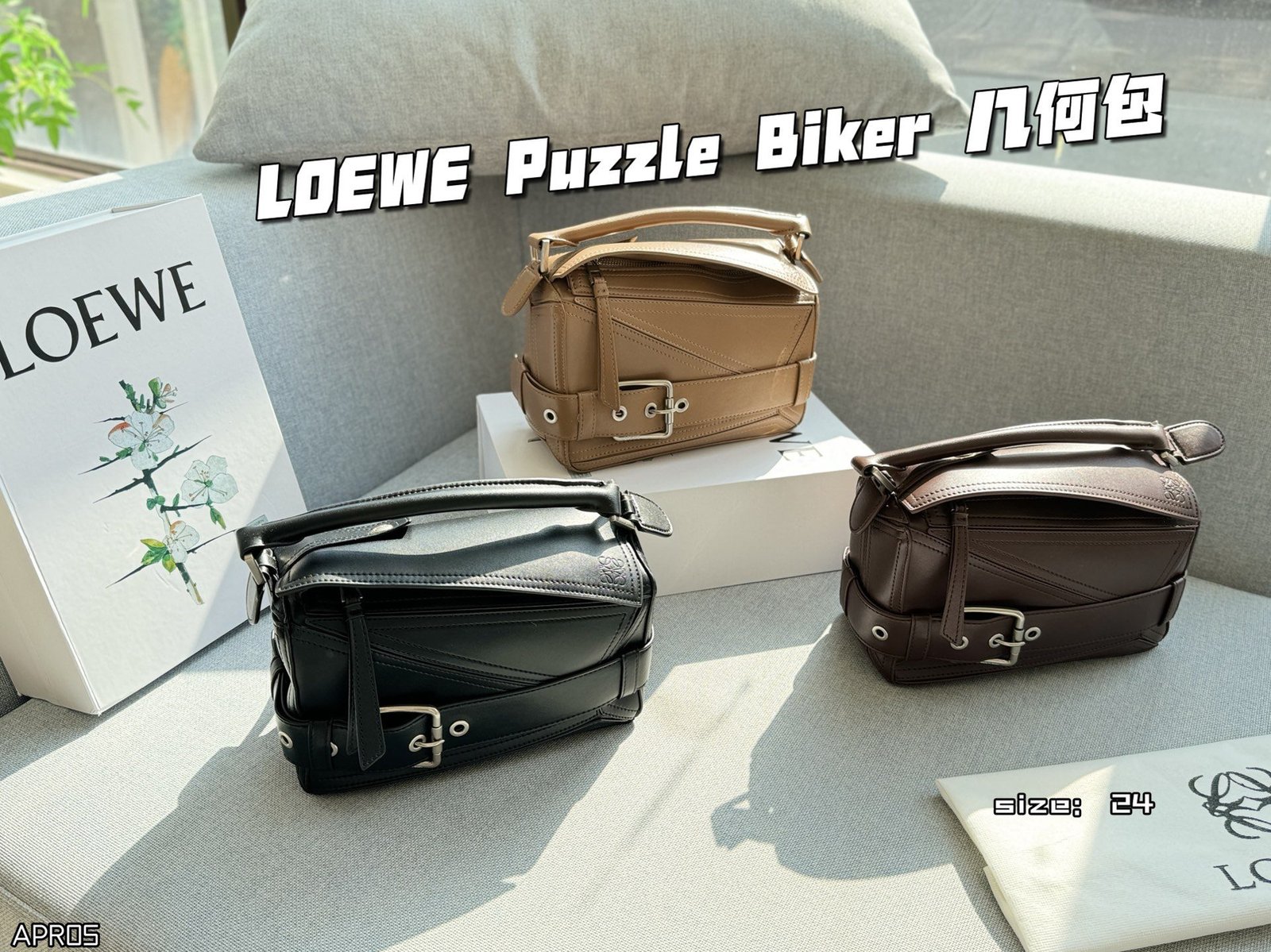 Loewe Puzzle Biker bags merge avant-garde design with rebellious flair, showcasing the brand’s iconic geometric construction, moto-inspired buckle accents, and refined hues like black, tan, and deep brown (size 24). Rooted in Loewe’s legacy of exceptional craftsmanship and bold styling, these bags blend artistic geometry with edgy functionality. Perfect for those who seek a fusion of architectural elegance and urban attitude, they make a striking statement for both casual outings and upscale gatherings.