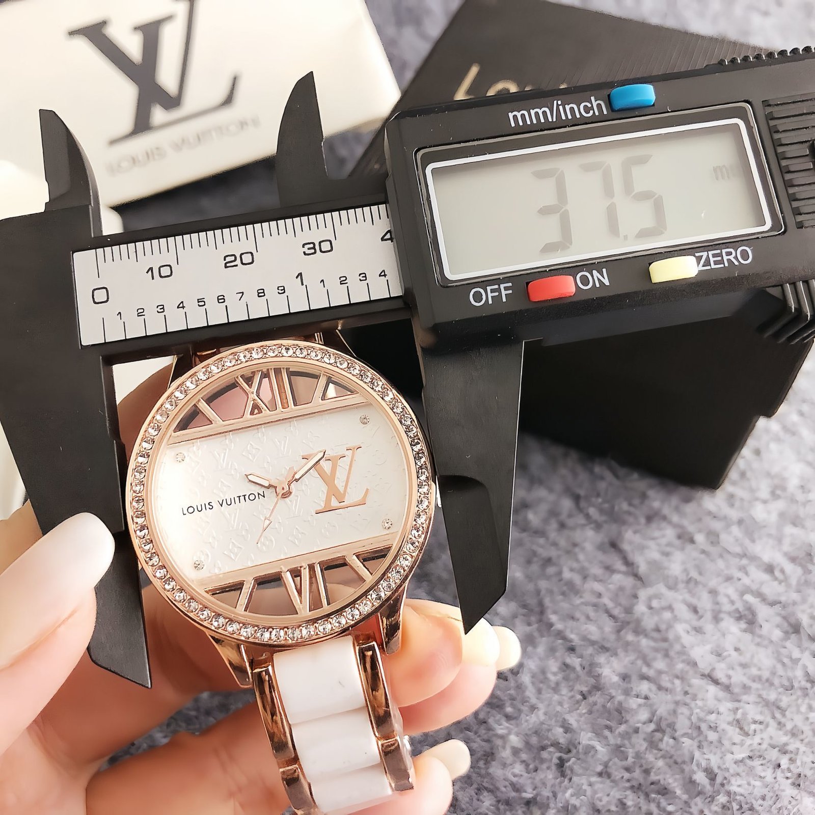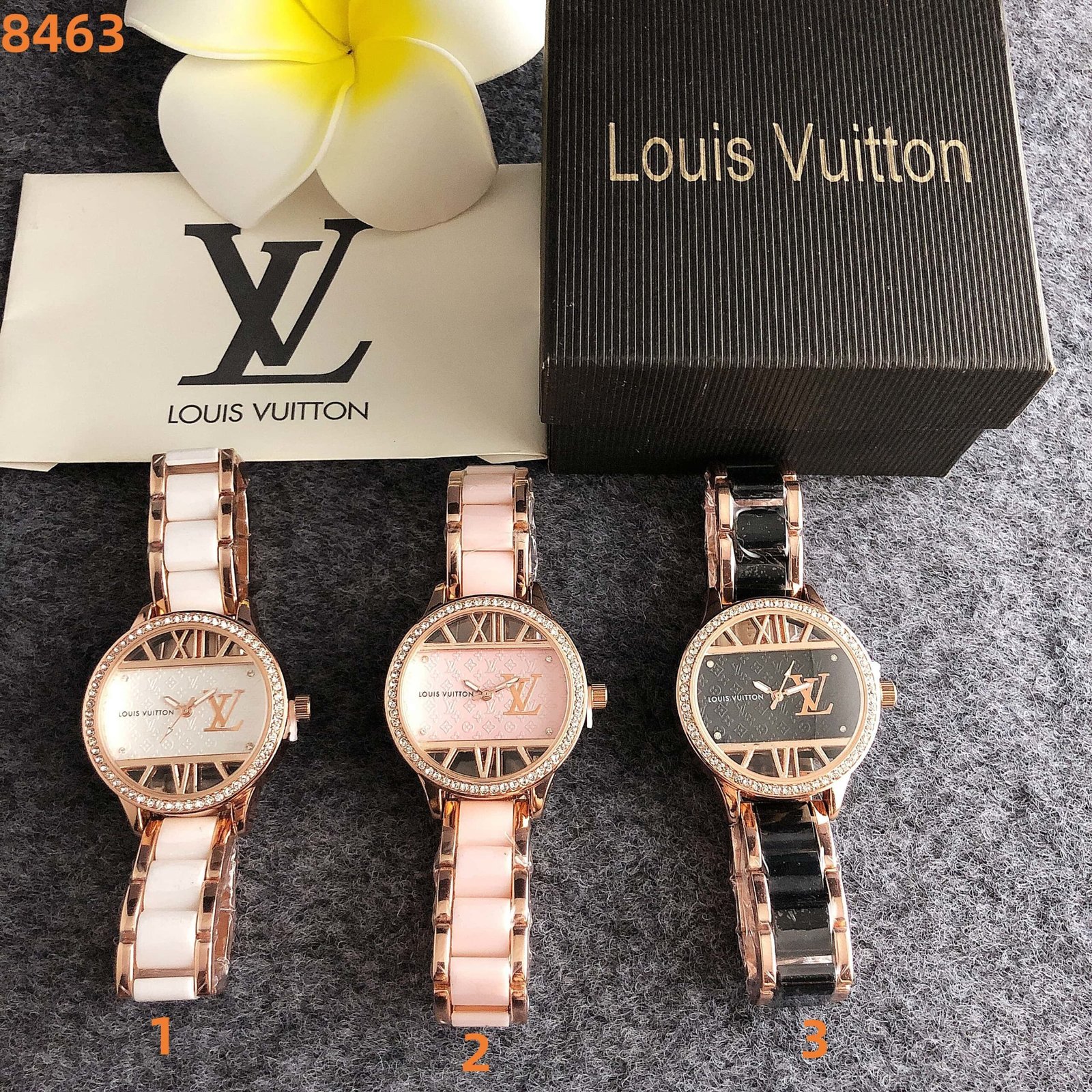 Louis Vuitton 8463 series watches blend luxury and style, featuring the iconic LV monogram, Roman numerals, and shimmering crystal details. Available in chic color combinations like rose gold with white, pink, and black, these timepieces pair elegant bracelets with sophisticated dials. Perfect for fashion enthusiasts, they embody Louis Vuitton’s signature blend of heritage and modernity, adding a touch of high-end glamour to any outfit, whether for special occasions or everyday sophistication.