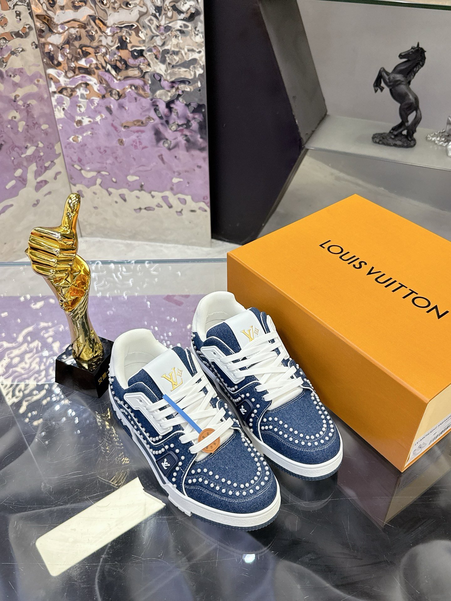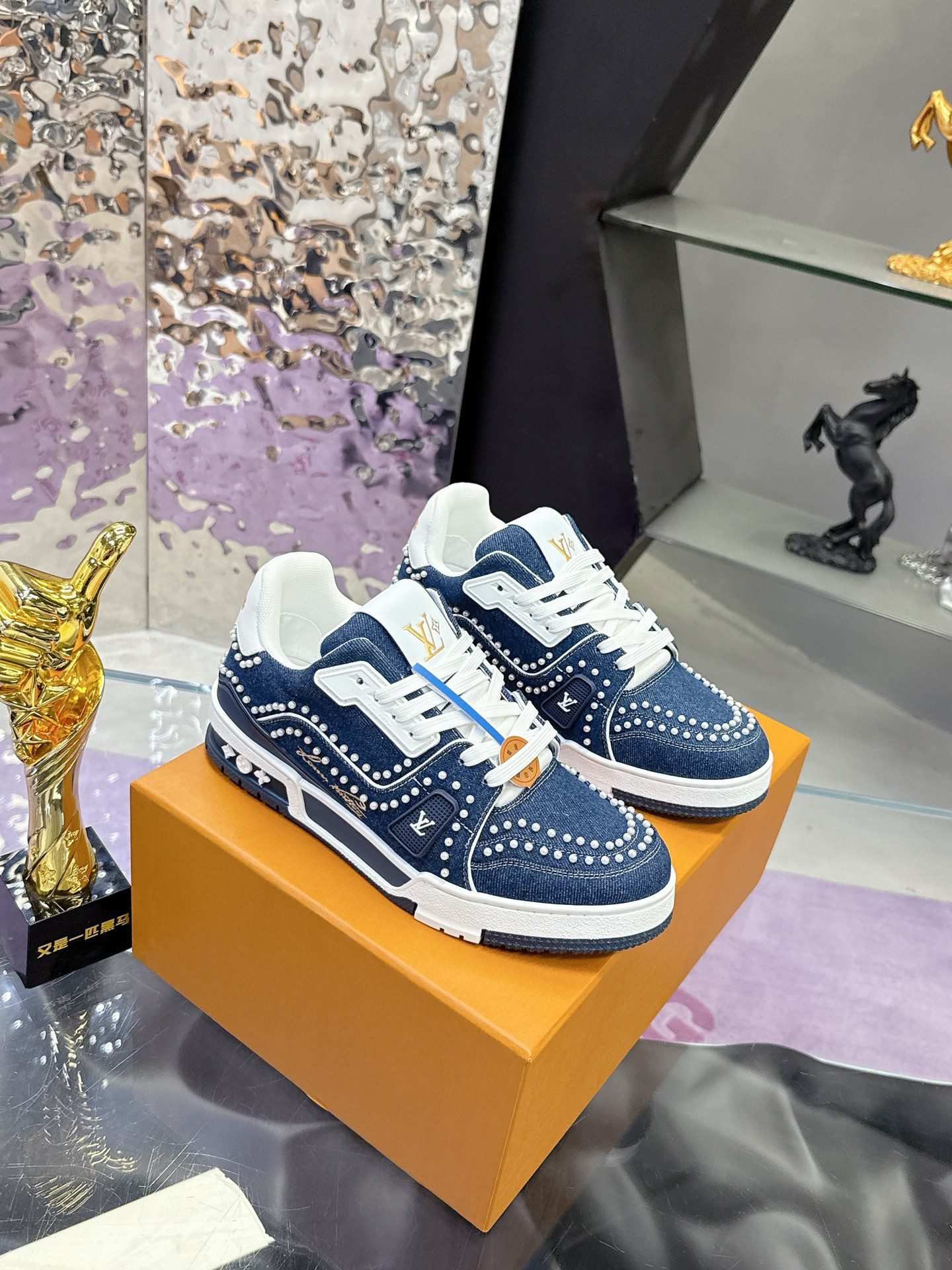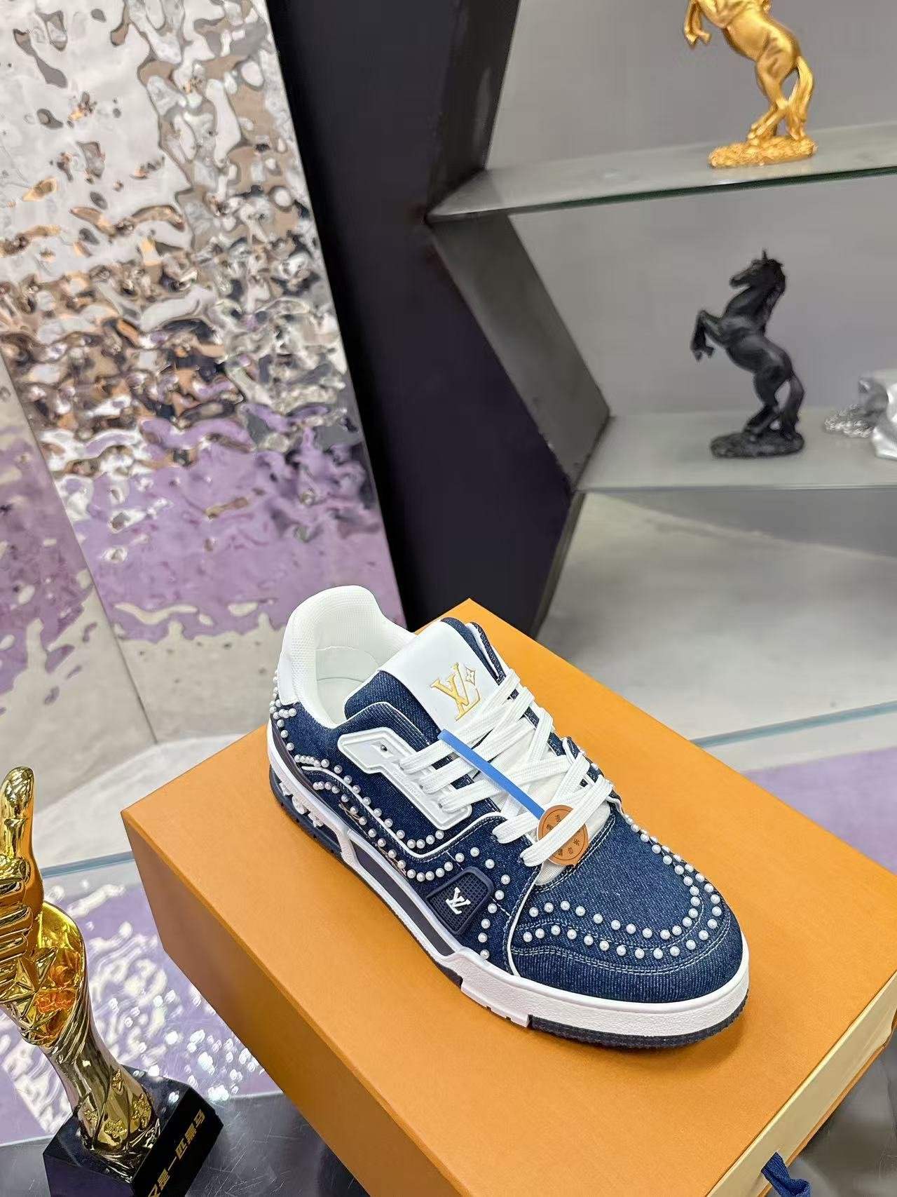 This Louis Vuitton Trainer sneaker features a denim base adorned with intricate studding, showcasing the brand’s iconic monogram elements and bold design aesthetic. Crafted with LV’s meticulous attention to detail, it merges streetwear edge with high-fashion luxury, making it a standout piece for those who dare to blend casual style with opulent craftsmanship. Perfect for sneaker enthusiasts and fashion-forward individuals, this pair is a testament to Louis Vuitton’s legacy of redefining luxury in every stitch and stud.