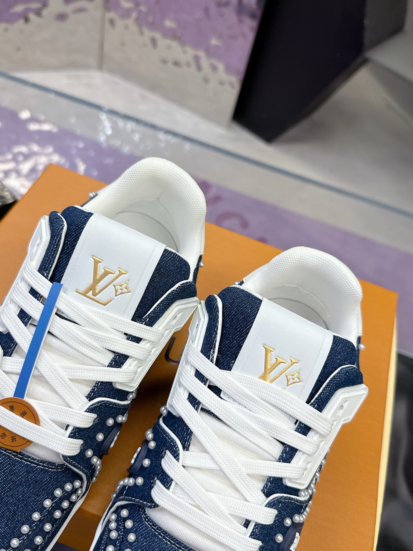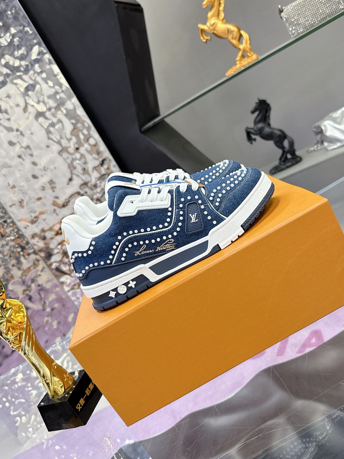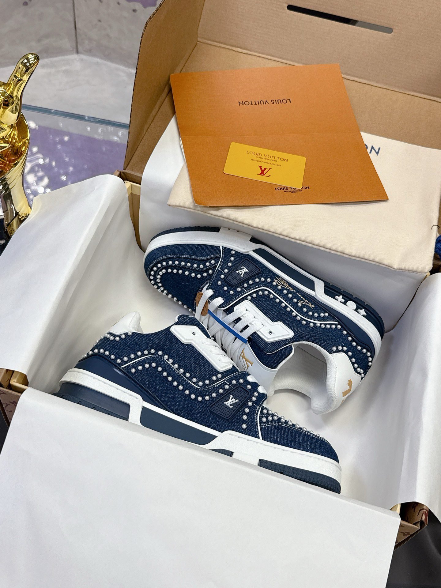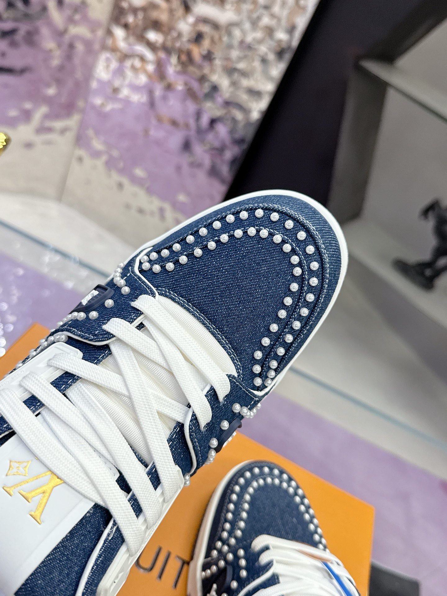 This Louis Vuitton Trainer sneaker features a denim base adorned with intricate studding, showcasing the brand’s iconic monogram elements and bold design aesthetic. Crafted with LV’s meticulous attention to detail, it merges streetwear edge with high-fashion luxury, making it a standout piece for those who dare to blend casual style with opulent craftsmanship. Perfect for sneaker enthusiasts and fashion-forward individuals, this pair is a testament to Louis Vuitton’s legacy of redefining luxury in every stitch and stud.