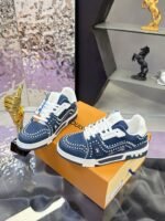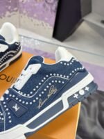 This Louis Vuitton Trainer sneaker features a denim base adorned with intricate studding, showcasing the brand’s iconic monogram elements and bold design aesthetic. Crafted with LV’s meticulous attention to detail, it merges streetwear edge with high-fashion luxury, making it a standout piece for those who dare to blend casual style with opulent craftsmanship. Perfect for sneaker enthusiasts and fashion-forward individuals, this pair is a testament to Louis Vuitton’s legacy of redefining luxury in every stitch and stud.