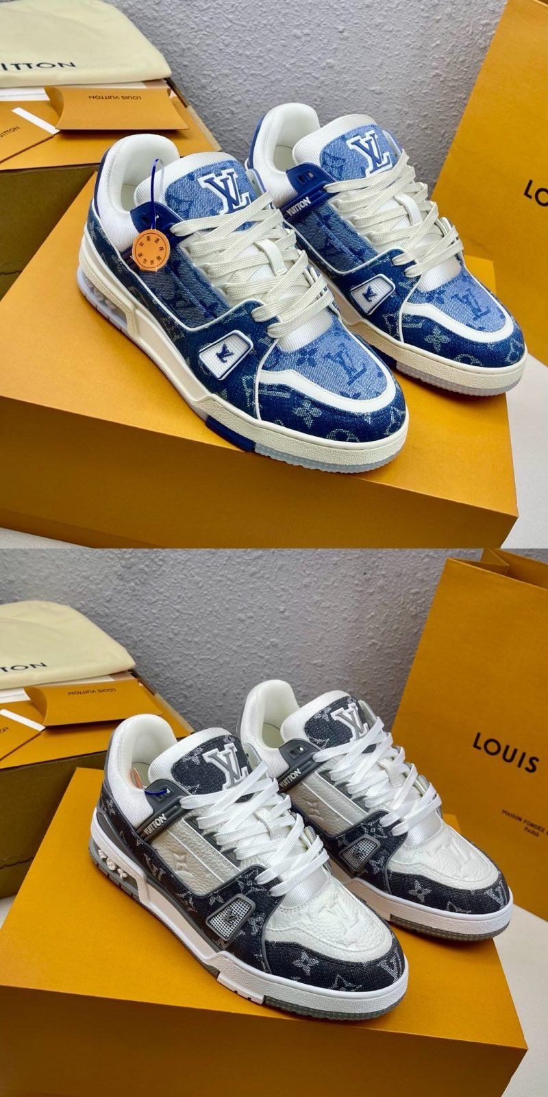 This Louis Vuitton Trainer sneaker collection features the brand’s signature monogram pattern on denim fabric, available in stylish blue and black denim colorways. Crafted with LV’s meticulous attention to detail, these sneakers blend casual denim vibes with luxury craftsmanship, making them a versatile choice for fashion enthusiasts. Perfect for those seeking footwear that embodies LV’s legacy of innovation and high-end style, each pair is a testament to the brand’s excellence in merging comfort and iconic design.