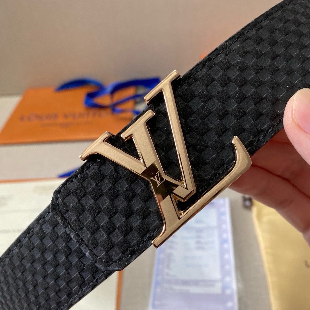 This Louis Vuitton gold V buckle black plaid belt shows unparalleled nobility and taste. Made of high-quality cowhide leather and processed with exquisite craftsmanship, the belt feels soft and delicate, tough and wear-resistant. The unique golden “LV” logo is made of high-quality metal material and has a shiny luster, highlighting the brand’s charm.