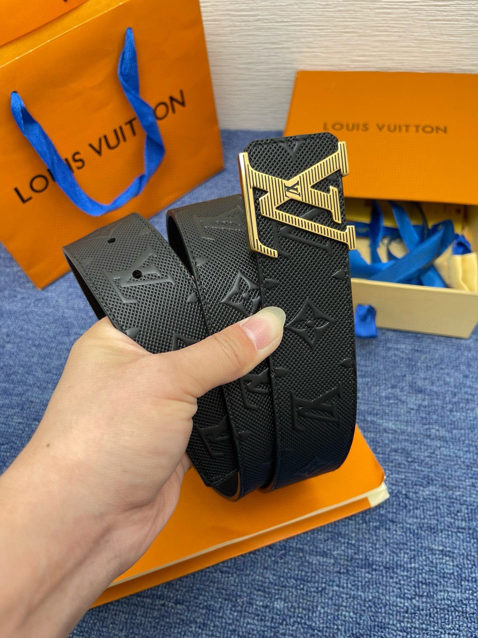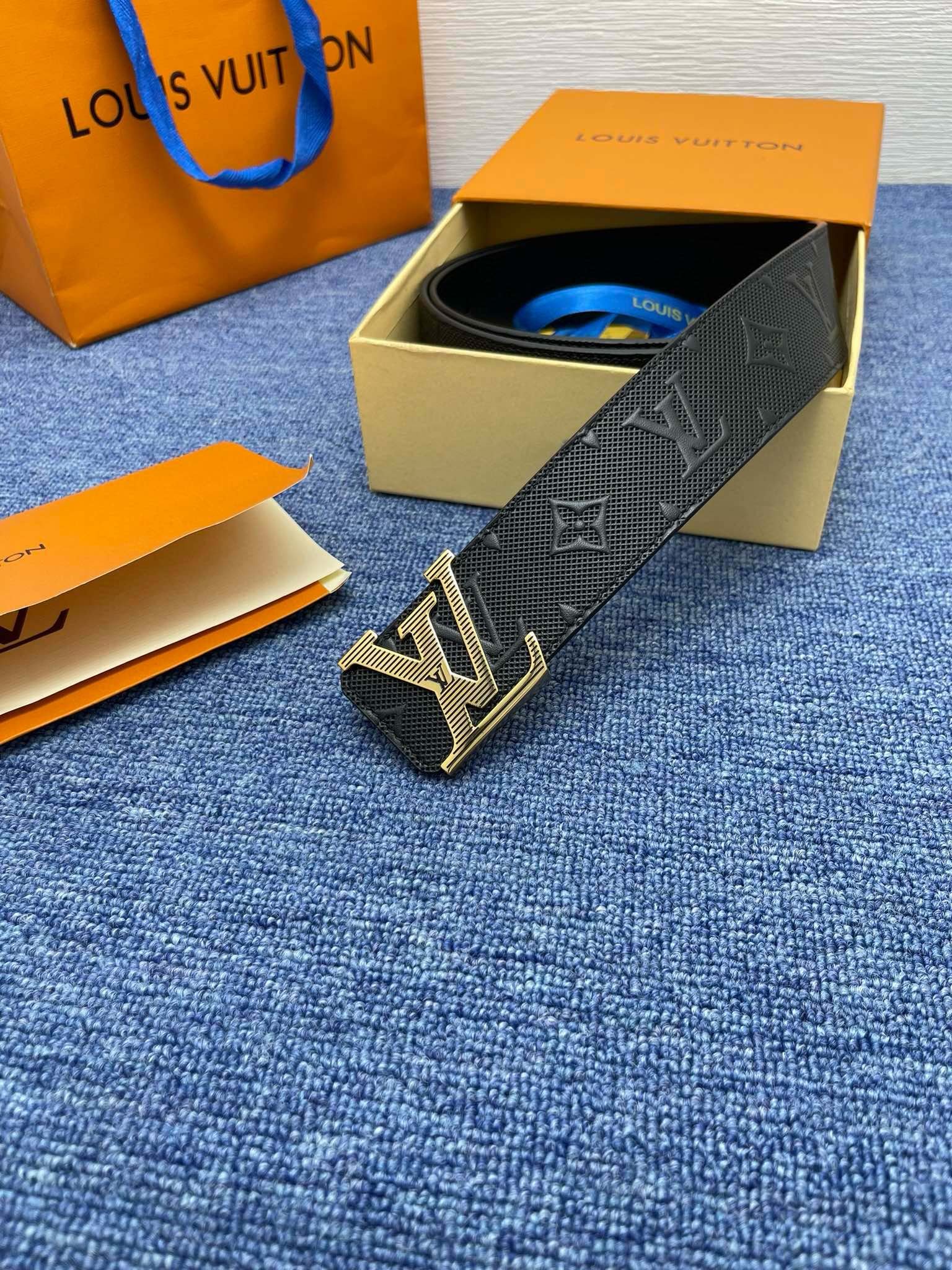 Louis Vuitton’s classic black leather men’s belt is made of top-grade leather material, with a soft and delicate touch, deep and shiny color. The gold buckle on the belt is exquisitely designed and engraved with the brand’s iconic “LV” letter pattern, showing its unparalleled noble temperament.