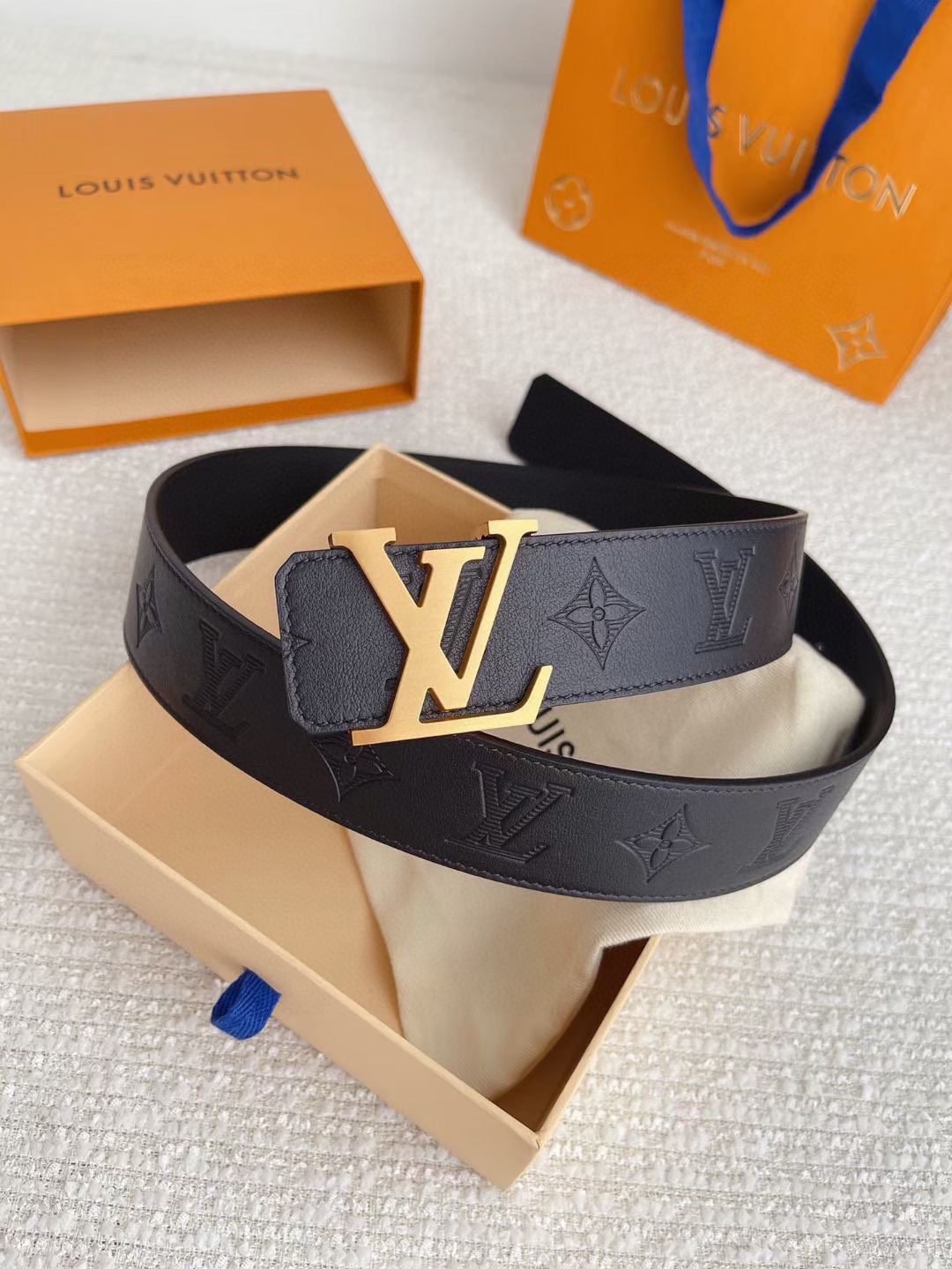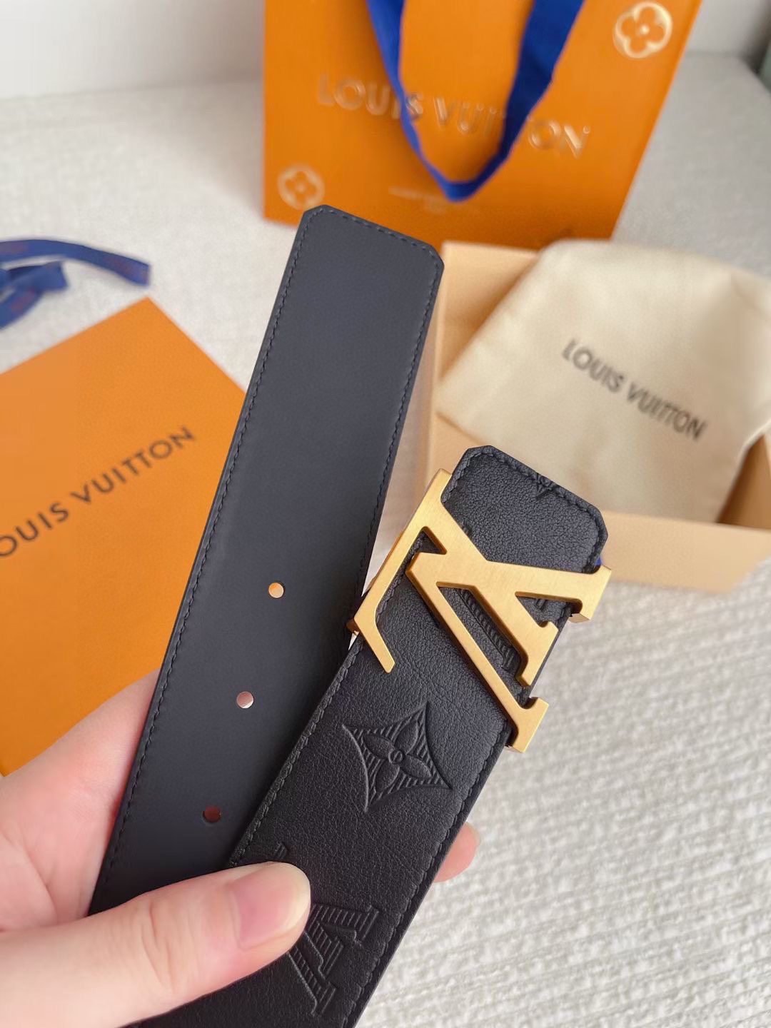 Louis Vuitton’s gold V-buckle and black textured belt has become an eternal classic in the fashion industry with its unique design and exquisite craftsmanship. The belt is made of high-quality black leather, which is delicate and smooth to the touch and has a long-lasting luster, showing a low-key and luxurious quality. The golden capital letter “LV” logo is inlaid on the belt buckle, which contrasts sharply with the belt, highlighting the nobility and uniqueness of the brand.
