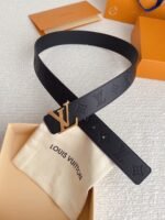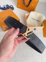 Louis Vuitton’s gold V-buckle and black textured belt has become an eternal classic in the fashion industry with its unique design and exquisite craftsmanship. The belt is made of high-quality black leather, which is delicate and smooth to the touch and has a long-lasting luster, showing a low-key and luxurious quality. The golden capital letter “LV” logo is inlaid on the belt buckle, which contrasts sharply with the belt, highlighting the nobility and uniqueness of the brand.