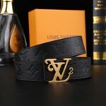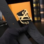 Louis Vuitton’s gold V-buckle black textured belt brings men the ultimate fashion experience with its unique charm and unparalleled quality. Selected top-quality black leather, finely sanded and polished, presents a deep and lustrous texture that will make you fall in love at first sight. The belt buckle head adopts the classic golden “LV” logo design, highlighting the brand’s nobility and luxury.