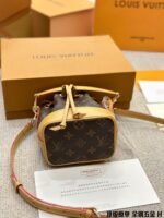 The Lv 23ss new Mini bucket handle is designed to have a larger capacity than the nano and smaller than the bb. Don’t miss the colorful microfiber adhesive lining, gold metal trim, and cord closure