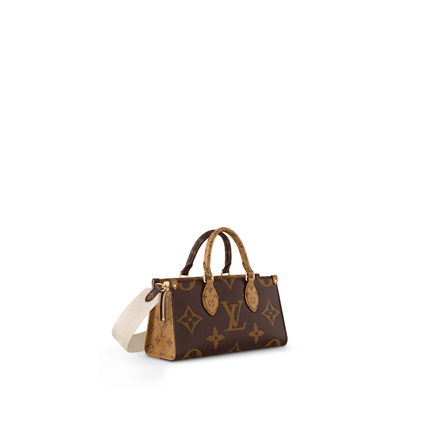 The Maison reinterprets the OnTheGo tote this season with a new east-west shape and a modern mix of Giant Monogram and Monogram Reverse canvas. Fitted with two Toron top handles and a wide, detachable strap, this beautifully proportioned bag can be styled in a variety of ways. A removable round coin purse completes this versatile design.