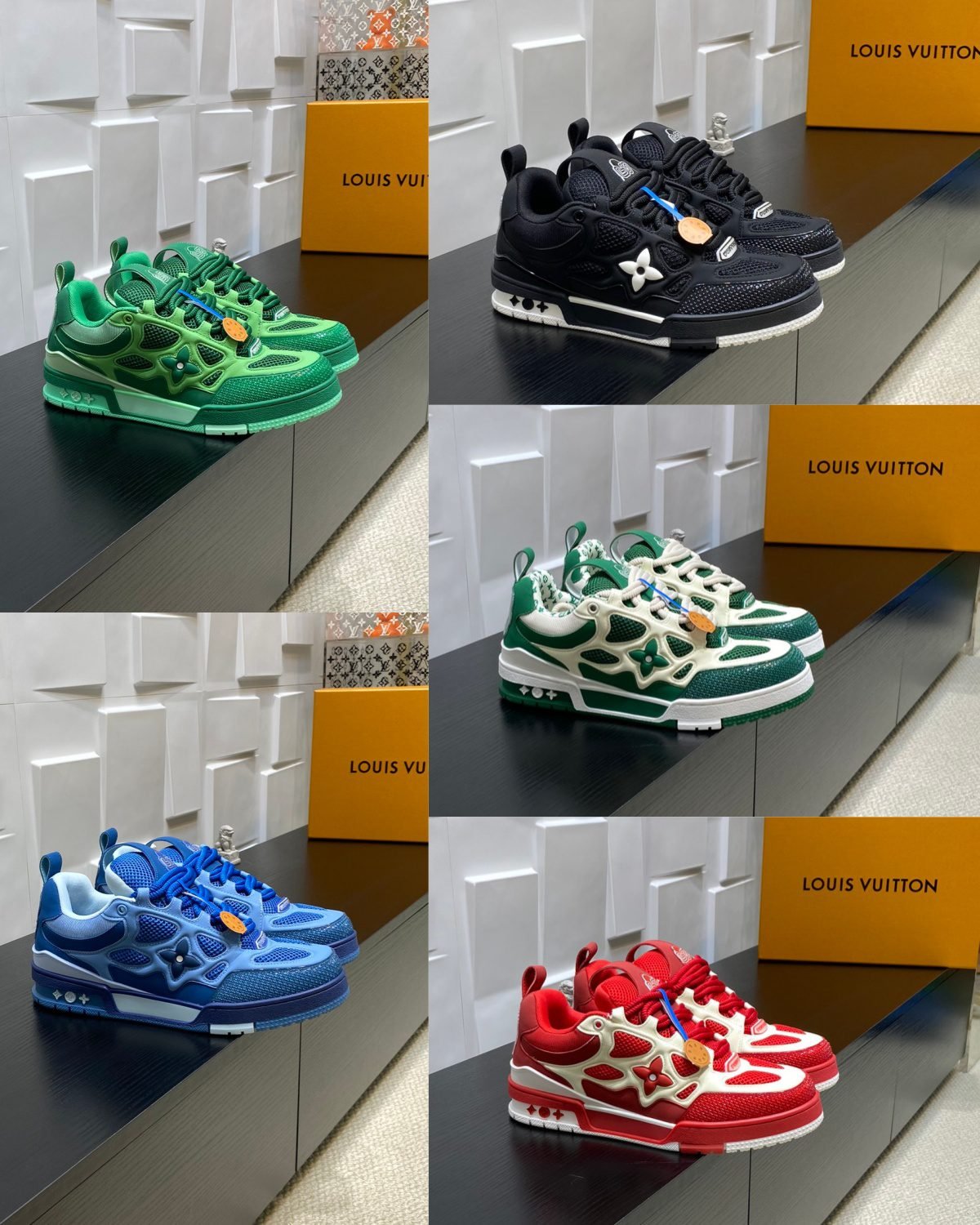 This Louis Vuitton LV Trainer Max sneaker collection showcases the brand’s iconic monogram-inspired cutouts, vibrant color palettes (green, black, blue, and red), and advanced sneaker technology. Crafted with LV’s unparalleled attention to detail, these sneakers blend avant-garde design with luxury comfort, making them a statement piece for sneakerheads and fashion connoisseurs alike. Perfect for those seeking footwear that embodies LV’s legacy of pushing boundaries in style and craftsmanship, each pair is a testament to the brand’s excellence in merging artistry and functionality.