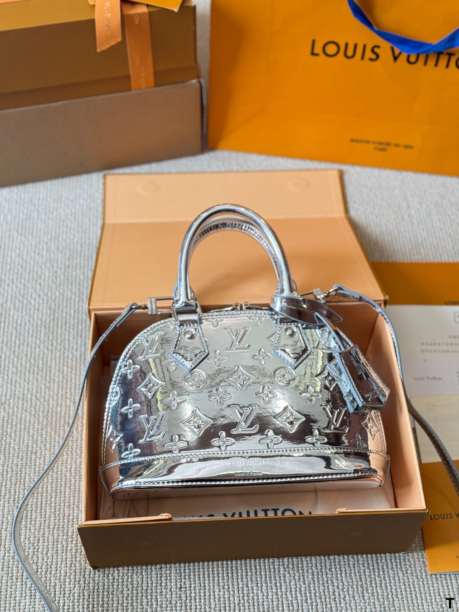 This Louis Vuitton Metallic Alma bag epitomizes futuristic luxury, featuring a striking silver patent leather finish, the brand’s iconic monogram embossing, and the timeless Alma silhouette. With Louis Vuitton’s legacy of innovative design and bold aesthetics, this bag seamlessly merges classic heritage with avant-garde glamour. Perfect for those who crave a blend of iconic style and head-turning shine, it makes a dazzling statement suitable for any high-profile occasion or fashion-forward ensemble.