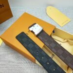 This Louis Vuitton silver V-buckle black plaid belt demonstrates unparalleled nobility and elegance with its exquisite craftsmanship and impeccable material selection. The belt is made of high-quality leather, which undergoes strict screening and exquisite processing technology to create an extremely soft and durable texture that feels silky and elastic. The belt buckle is made of the brand’s iconic silver metal material and is inlaid with the eye-catching “LV” letter logo. It is simple yet fashionable, highlighting the brand’s unique charm.