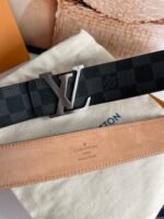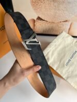 Louis Vuitton silver V buckle black plaid belt. The belt is made of top-quality leather, which is soft to the touch and durable. The brown part on the reverse exudes a warm and elegant atmosphere, while the black part on the front shows calmness and nobility. The unique LV logo fastener is made of exquisite metal craftsmanship and has a shining luster, highlighting the brand’s extraordinary charm.、