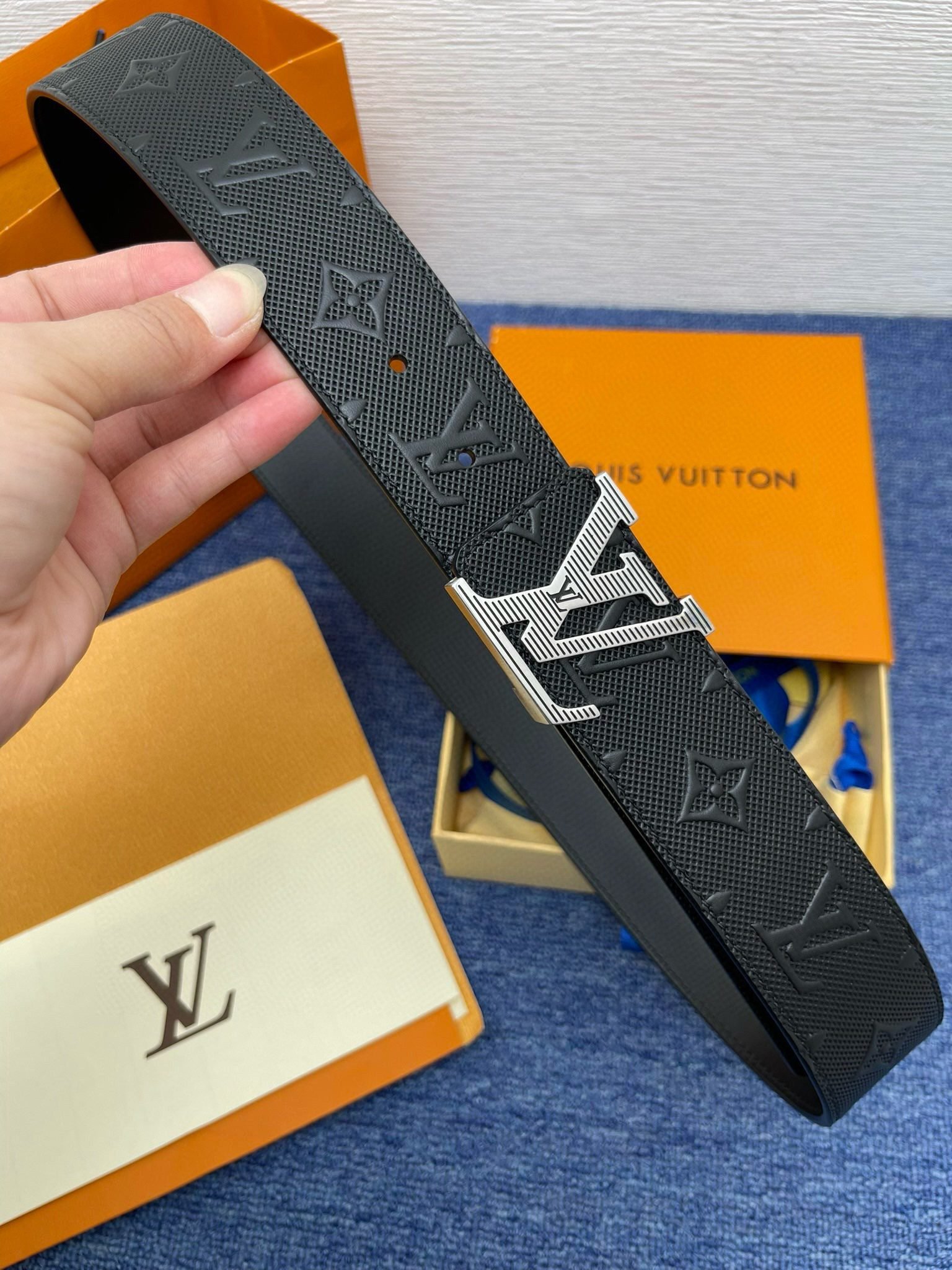 Louis Vuitton’s silver V-buckle black textured belt is made of top-quality leather, which is soft and elastic to the touch, showing a deep and low-key black charm. The belt buckle is made of exquisite silver metal and is engraved with the brand’s iconic “LV” letter pattern, highlighting the brand’s unique noble temperament.