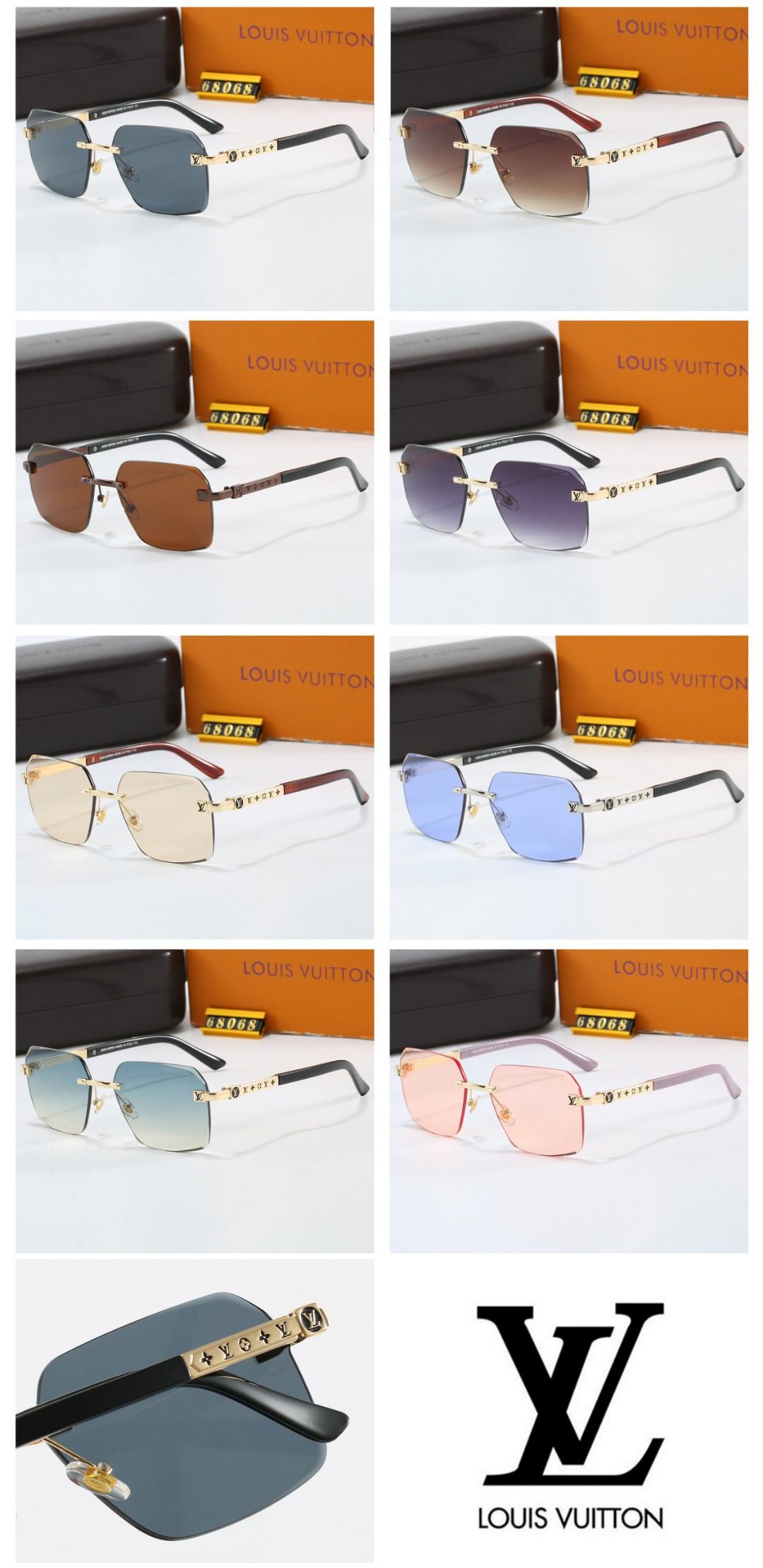 Elevate your accessory collection with Louis Vuitton’s square sunglasses. Showcasing a range of elegant styles, from gradient – tinted lenses in shades like brown, purple, and blue to soft pink and beige designs, these sunglasses blend a chic square frame with the brand’s iconic luxury, highlighted by intricate gold – toned detailing.