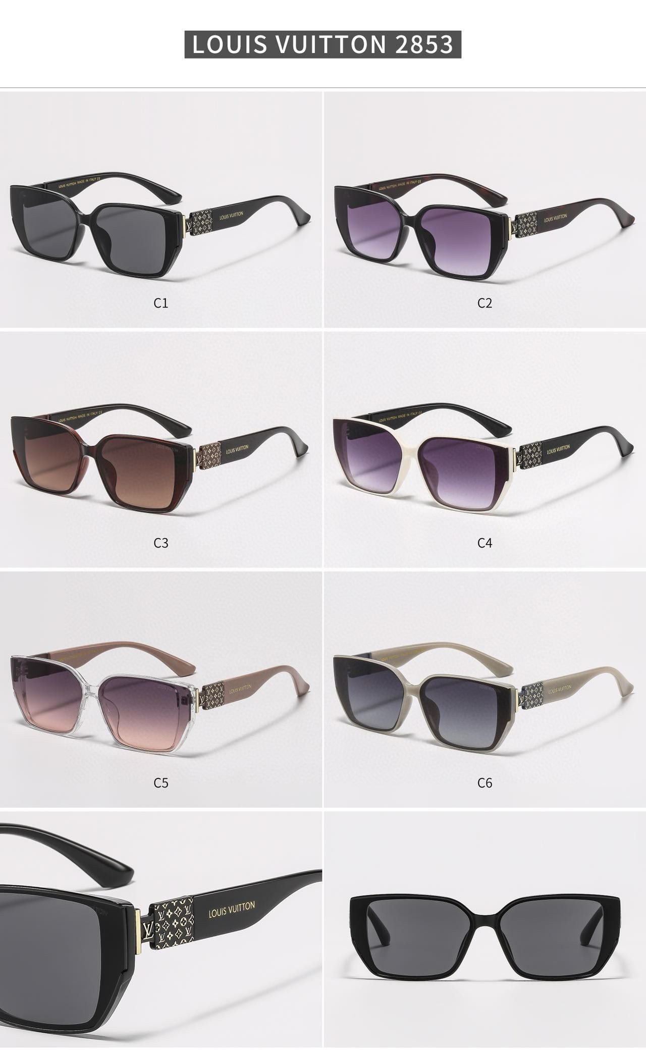 Elevate your accessory game with Louis Vuitton’s sunglasses (Model 2853). Featuring a range of stylish options—from classic black and gradient purple lenses to designs with tortoiseshell, white, and transparent frames, all adorned with the iconic LV monogram detailing on the temples—these sunglasses blend a chic square silhouette with the brand’s signature luxury.