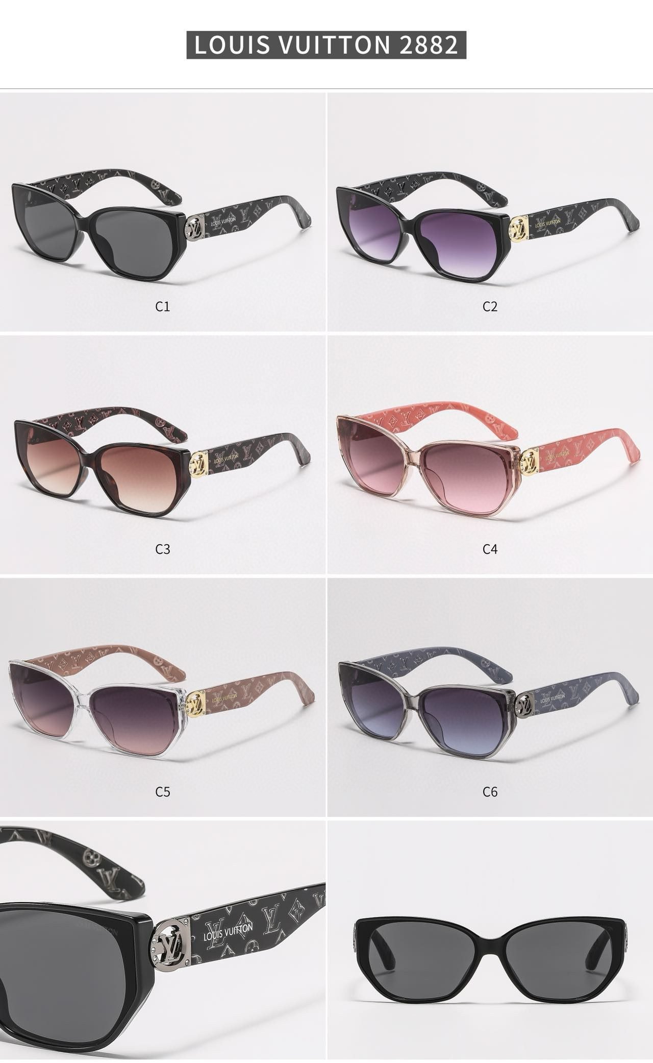 Elevate your accessory collection with Louis Vuitton’s sunglasses (Model 2882). Featuring a range of stylish cat – eye options—from classic black and gradient purple lenses to designs with tortoiseshell, pink, brown, and blue frames, all adorned with the iconic LV monogram detailing on the temples—these sunglasses blend a chic silhouette with the brand’s signature luxury.